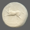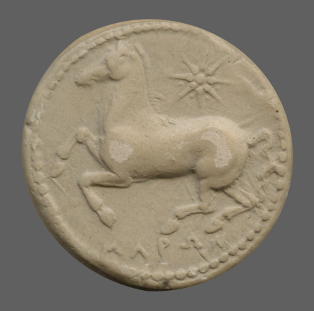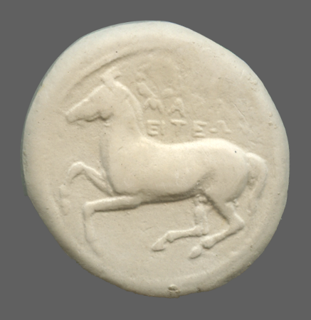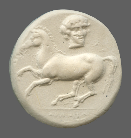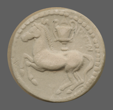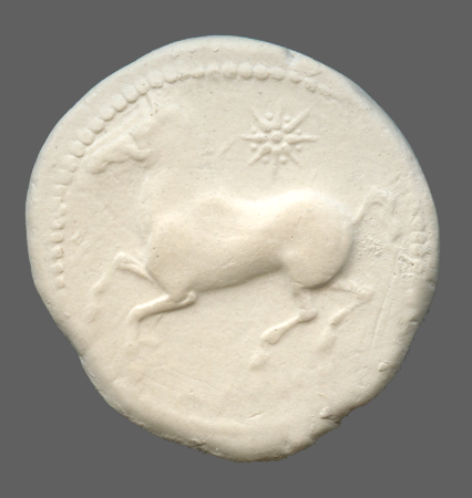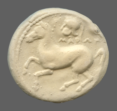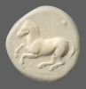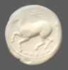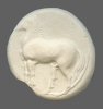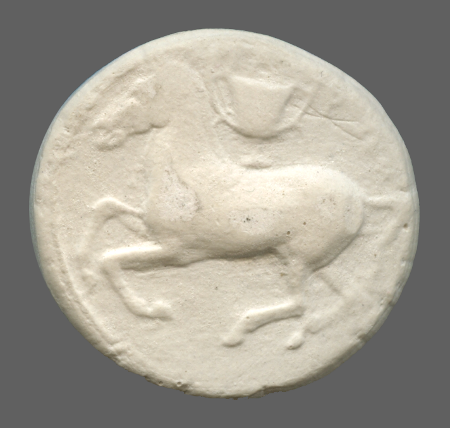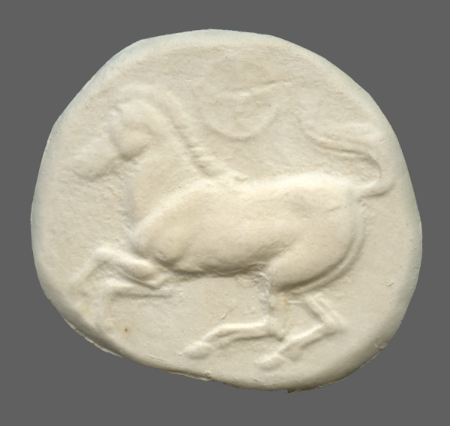Forepart of prancing horse, left.