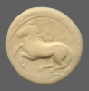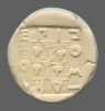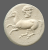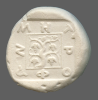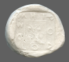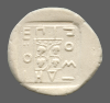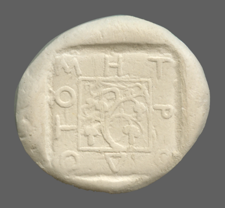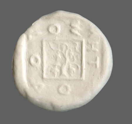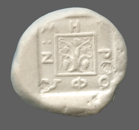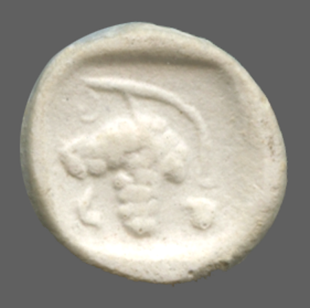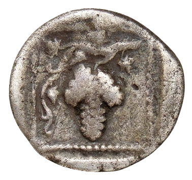 Vine with four bunches of grapes, growing out of the head of a silen, within linear square; all within incuse square.