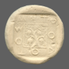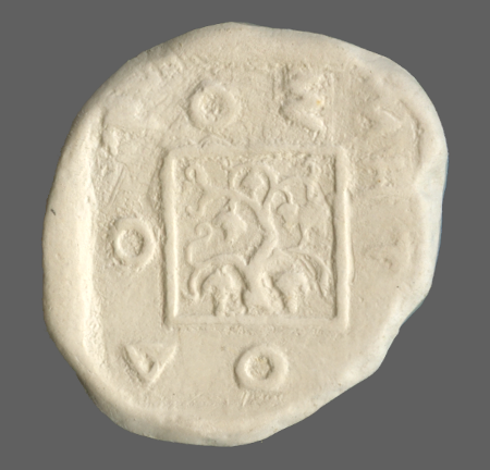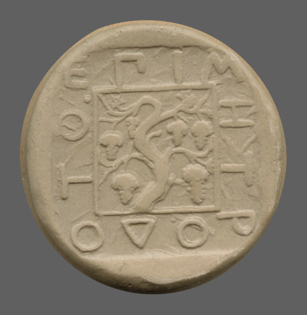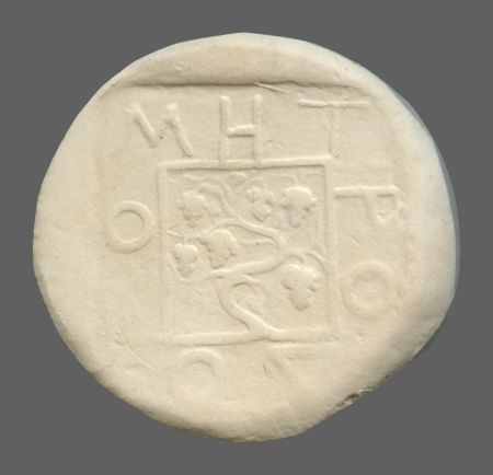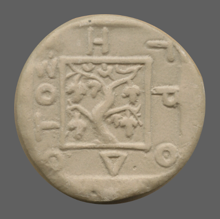 Bunch of grapes on vine branch within dotted incuse square.