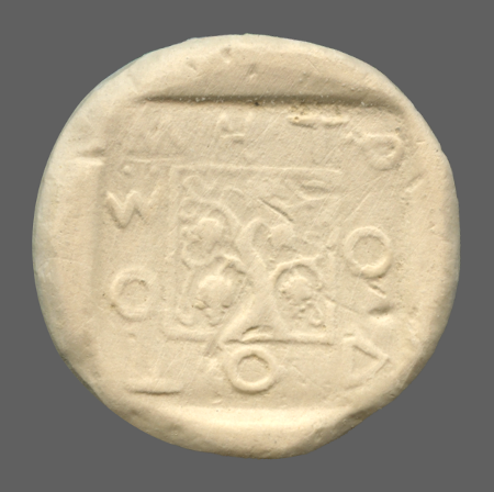 Bunch of grapes within incuse square.