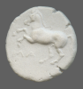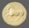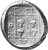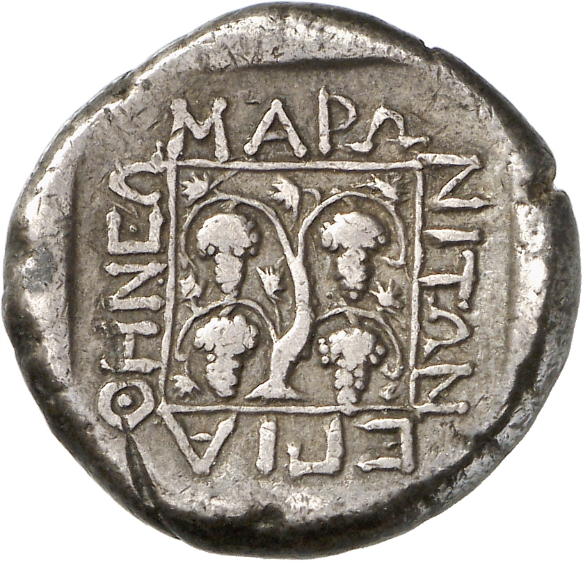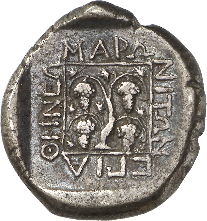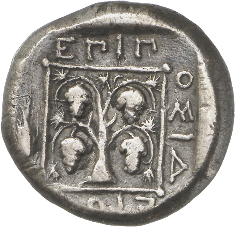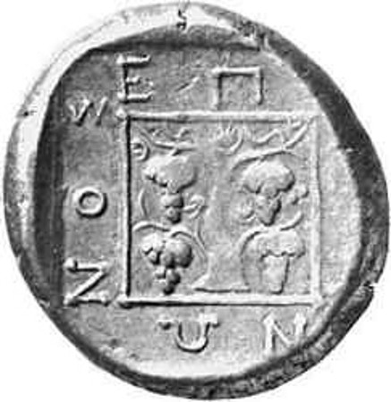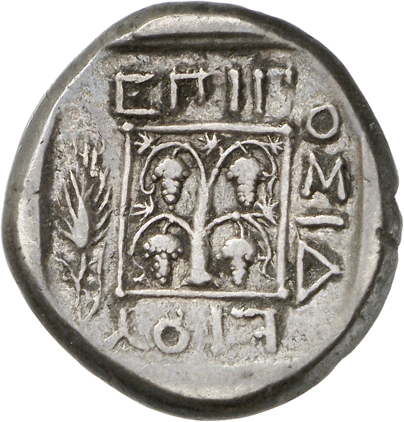 Vine with four bunches of grapes within linear square; all within incuse square.