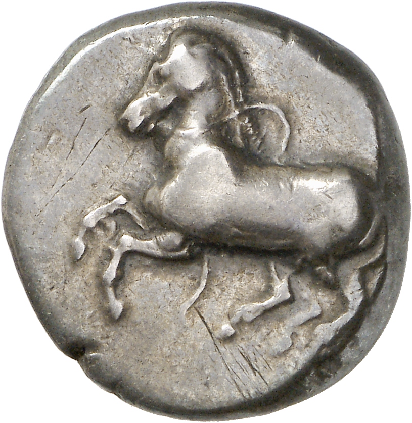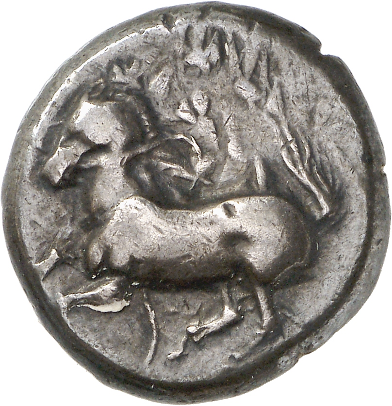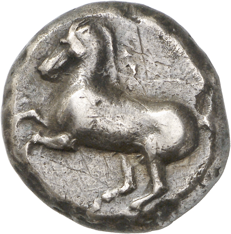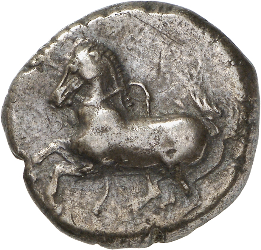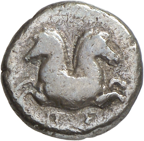 Two conjoined foreparts of prancing horses; ornated with acanthus leaves.