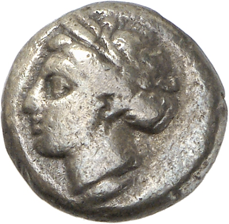 Head of Demeter, left, wearing corn wreath, earring and necklace.