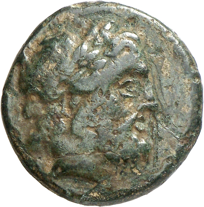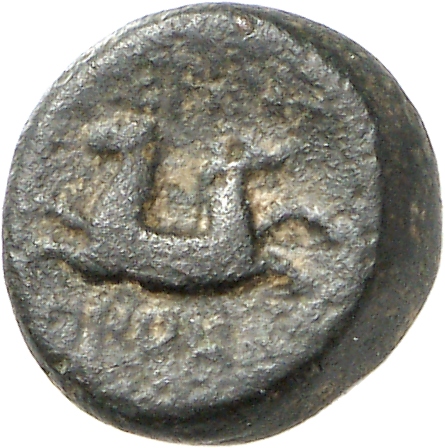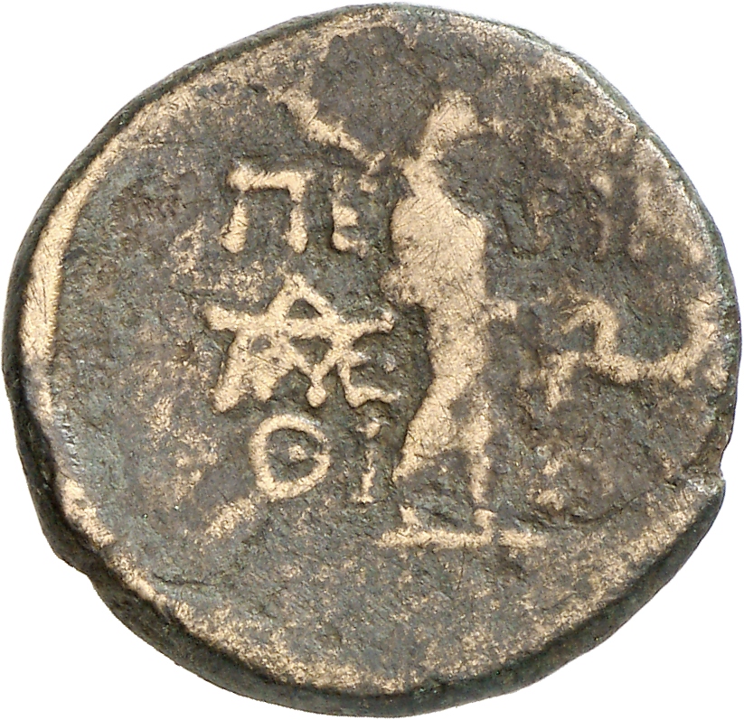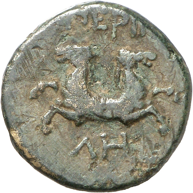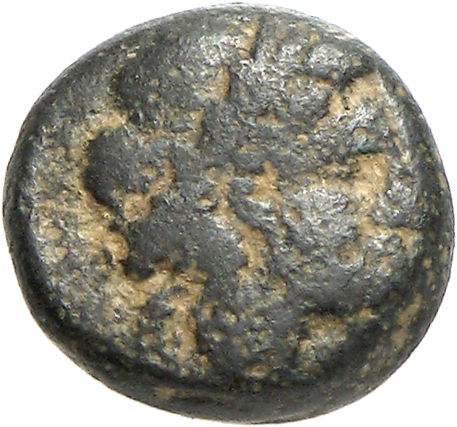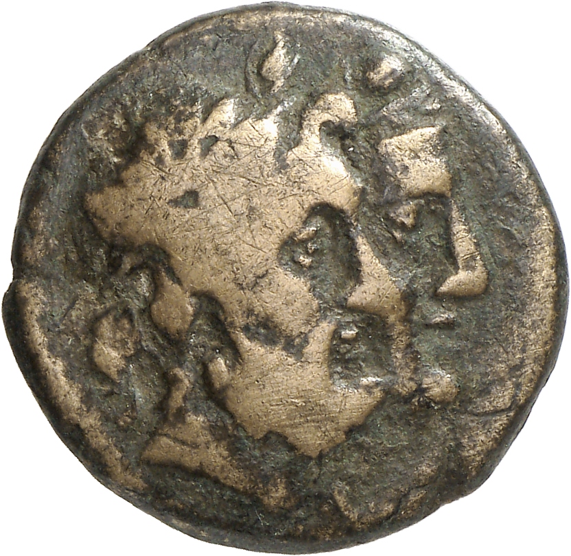 Jugate heads of Serapis, wearing lotus, and of Isis, wearing her headdress, right.