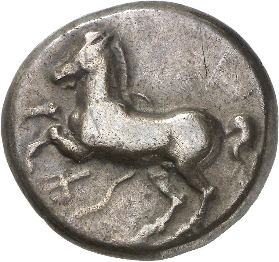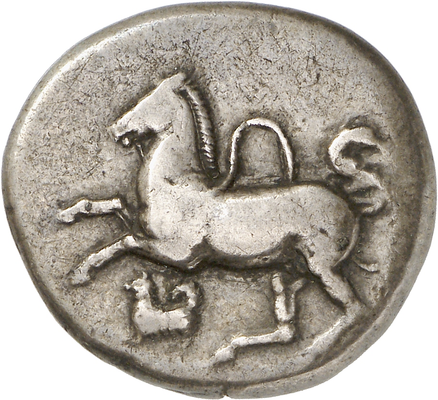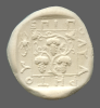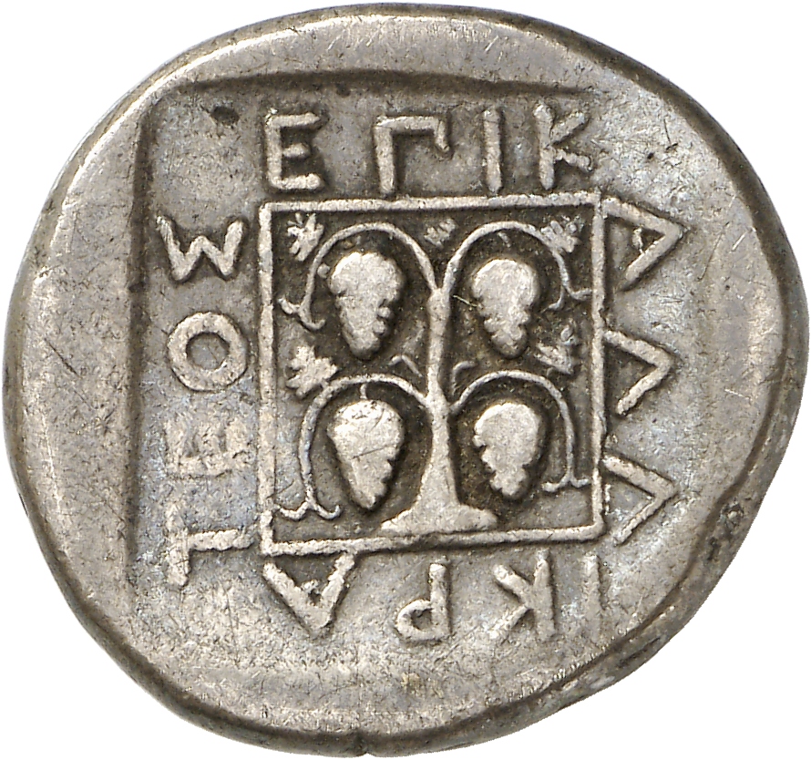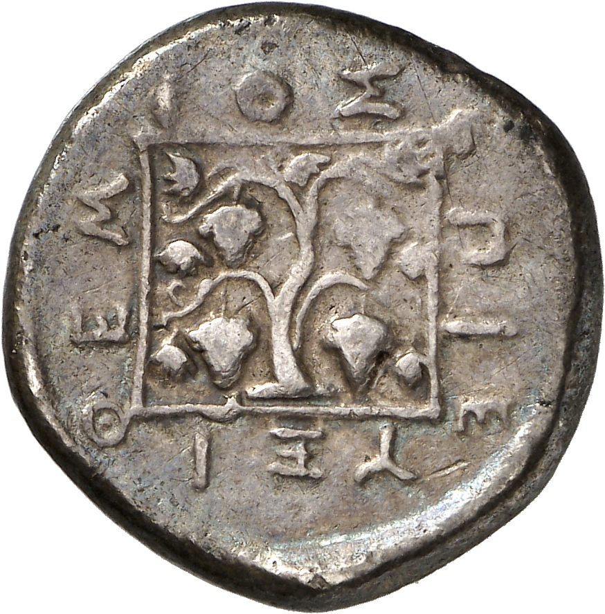 Vine with four bunches of grapes within linear square; all within incuse square.