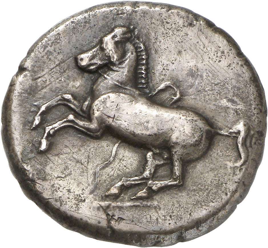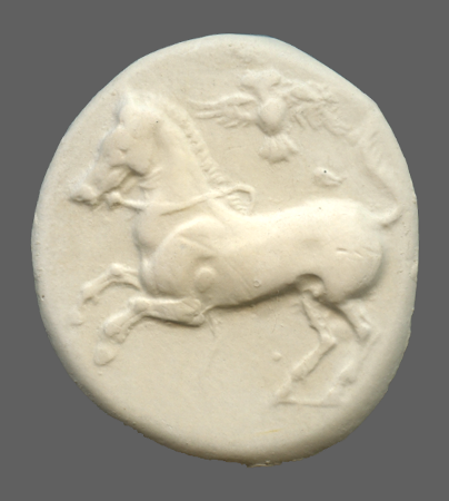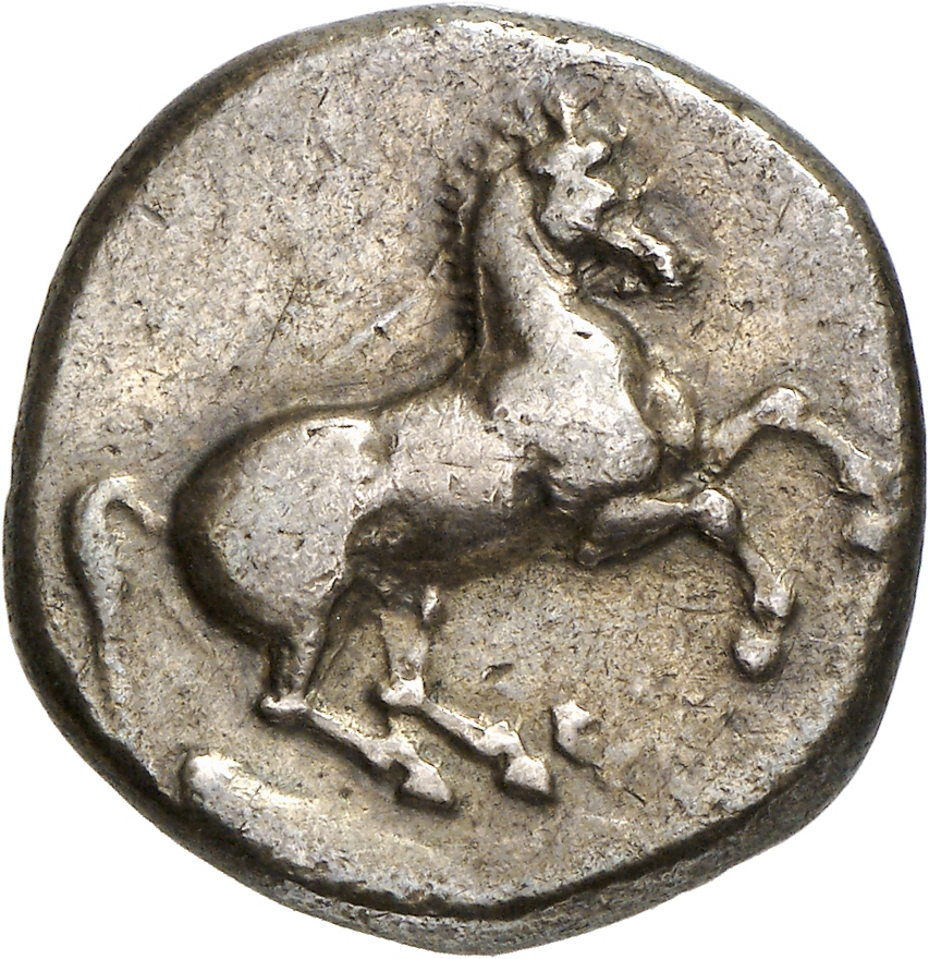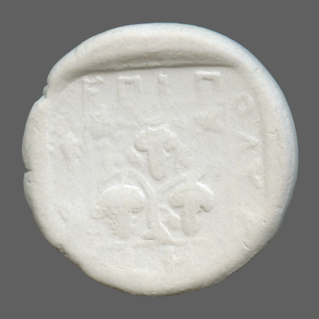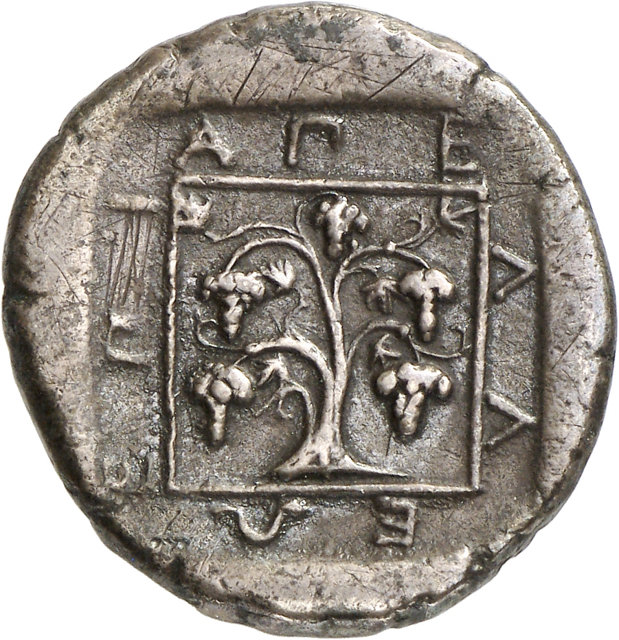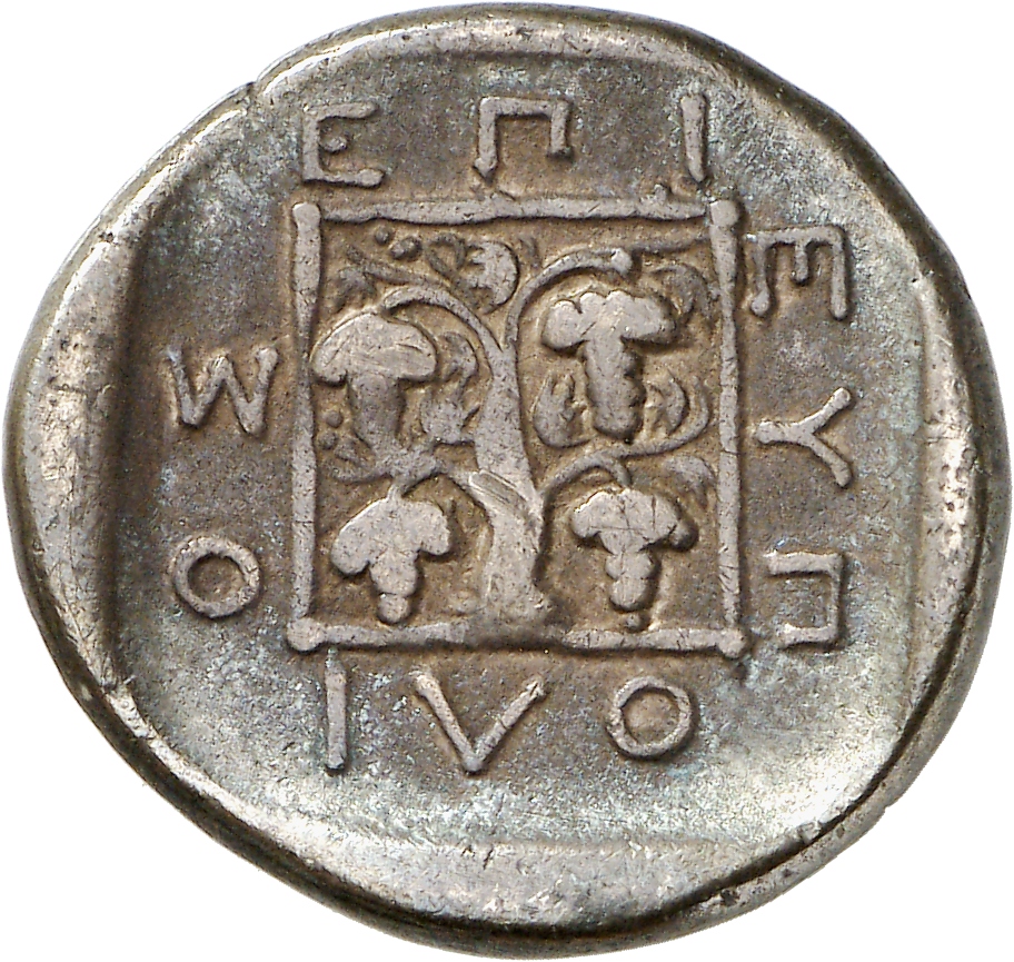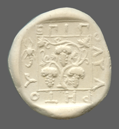 Vine with five bunches of grapes within linear square; all within incuse square.