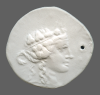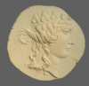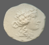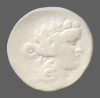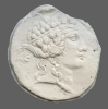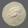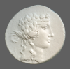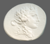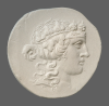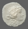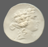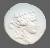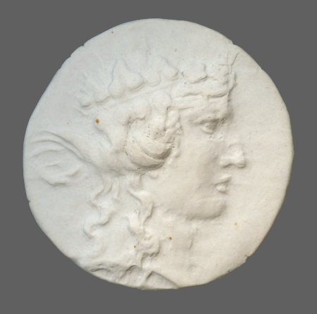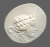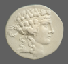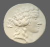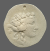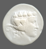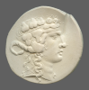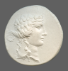 Head of (youthful) Dionysus, right, wearing ivy wreath and taenia.
