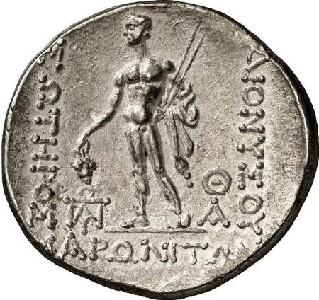 Nude Dionysus standing left, holding bunch of grapes and two spears.