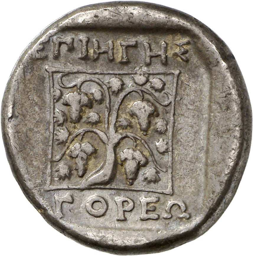 Vine with four bunches of grapes within linear square; all within incuse square.