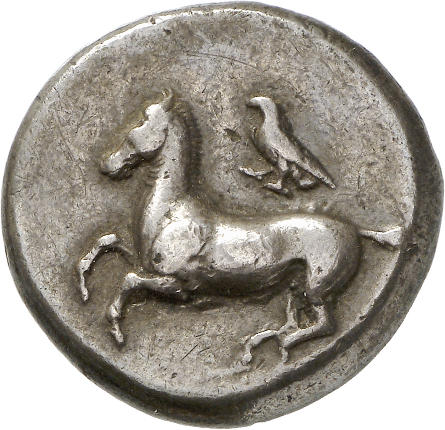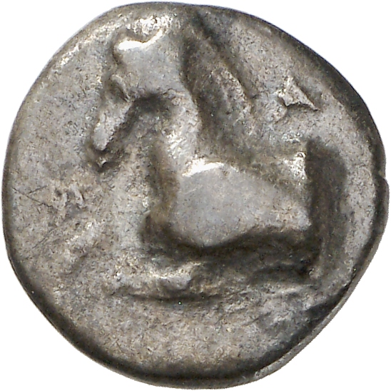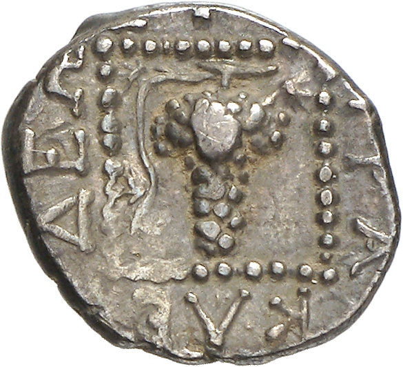 Vine with three bunches of grapes within linear square; all within incuse square.