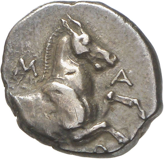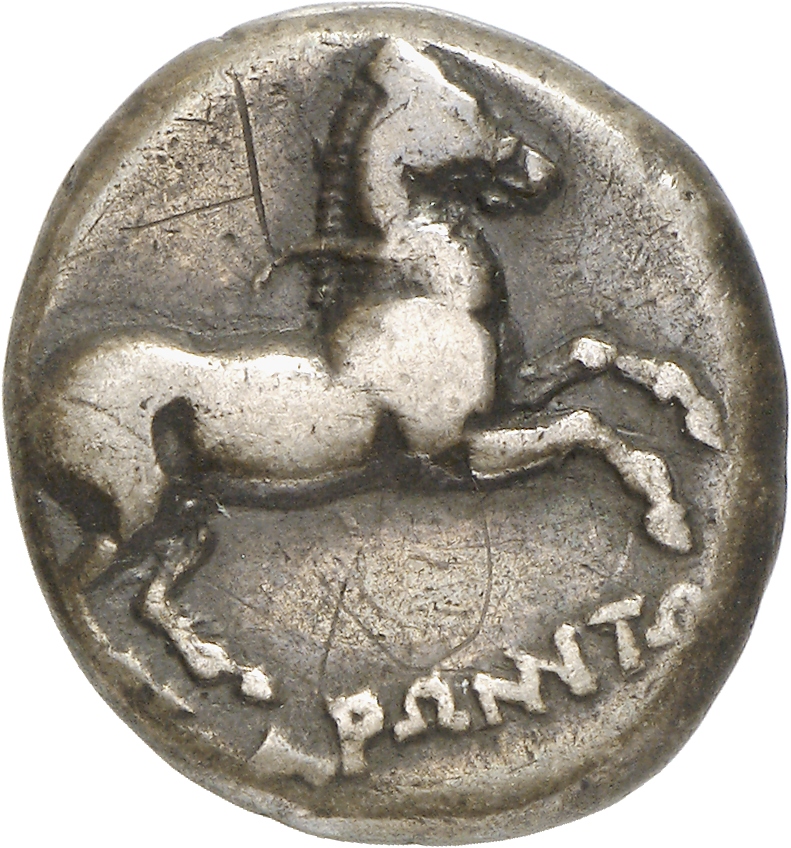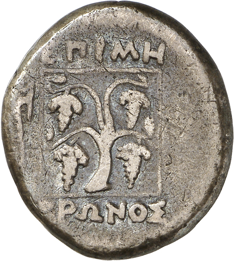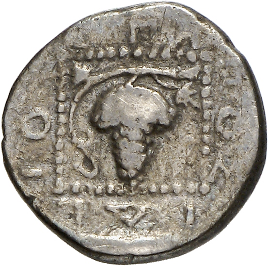 Bunch of grapes on vine branch within dotted square border, surrounded by magistrate's name; all within incuse square.