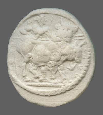 Horseman (Hermes?) standing right with petasus and double spear pointing upward, leading horse right.