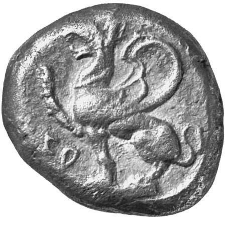 Triskeles consisting of bulls' legs within circular incuse.
