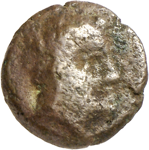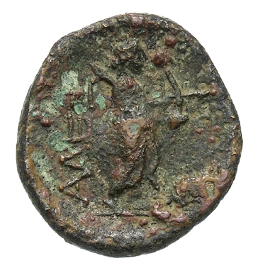 Apollo Smintheus standing right, quiver on shoulder, holding bow, arrow and patera; at his feet, mouse.
