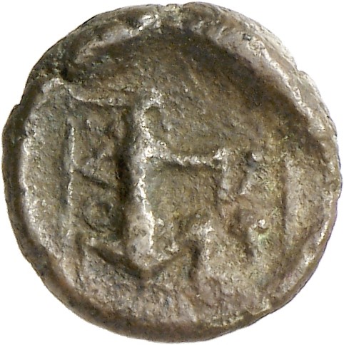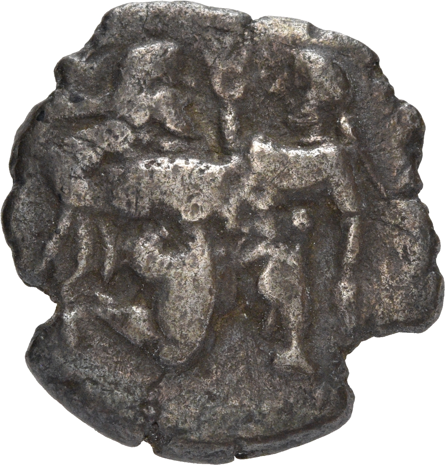 Heracles kneeling right, wearing lion skin, drawing bow.
