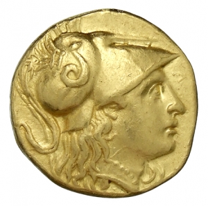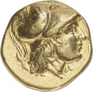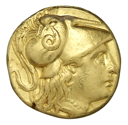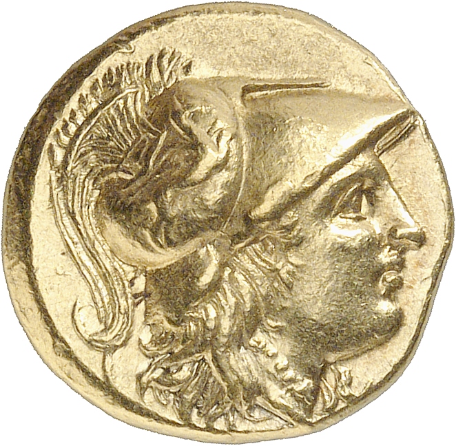 Head of Athena right wearing Corinthian helmet with crest; griffin on bowl of helmet