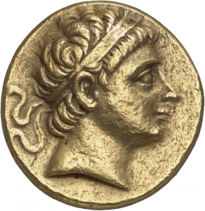 BAΣΙΛΕΩΣ ANTIOXOY: Apollo seated left on omphalos, testing arrow and resting left hand on grounded bow
