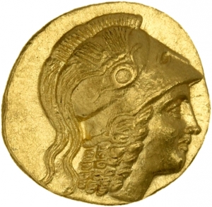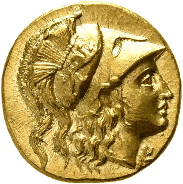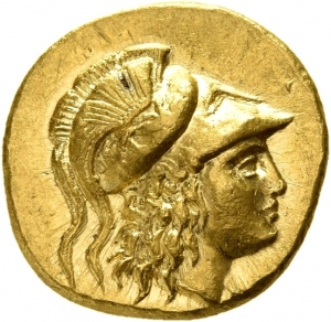 Tête d'Athéna coiffée d'un casque corinthien à cimier à dr., griffon sur le casque