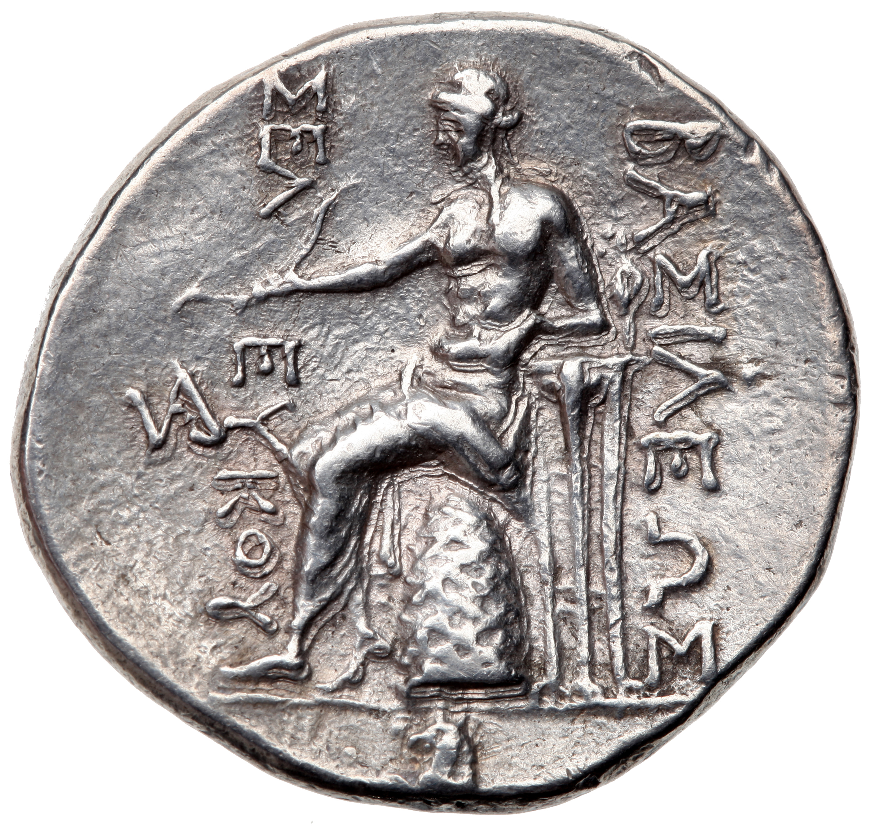 BAΣΙΛΕΩΣ ΔHMHTPIOY ΘEOY NIKATOPOΣ: Athena standing left, holding Nike facing right and offering wreath, left hand resting on grounded shield, vertical spear behind