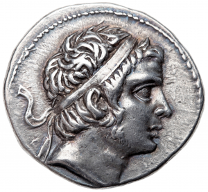 BAΣΙΛΕΩΣ ANTIOXOY EΠIΦANOYΣ: Athena standing left, holding Nike facing right and offering wreath, left hand resting on grounded shield, vertical spear behind