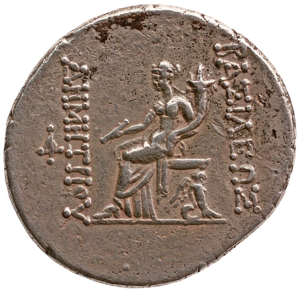 BAΣΙΛΕΩΣ ANTIOXΟΥ ΘEOY EΠIΦANOYΣ NIKHΦOPOY: Zeus assis sur un trône à haut dossier à gauche, tenant un aigle dans sa main droite tendue et un sceptre dans la gauche