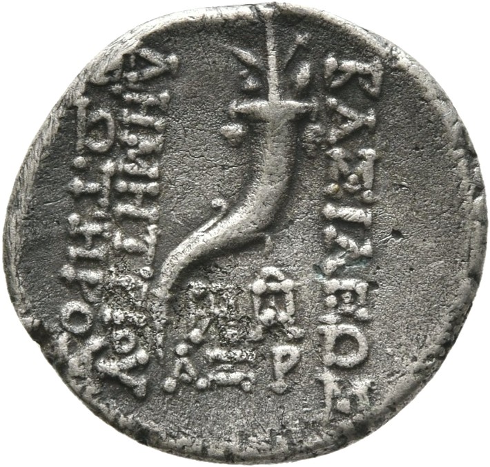 BAΣΙΛΕΩΣ ANTIOXOY EΠIΦANOYΣ: Zeus seated on high-backed throne left, holding Nike facing right offering wreath on outstretched right hand and sceptre in left