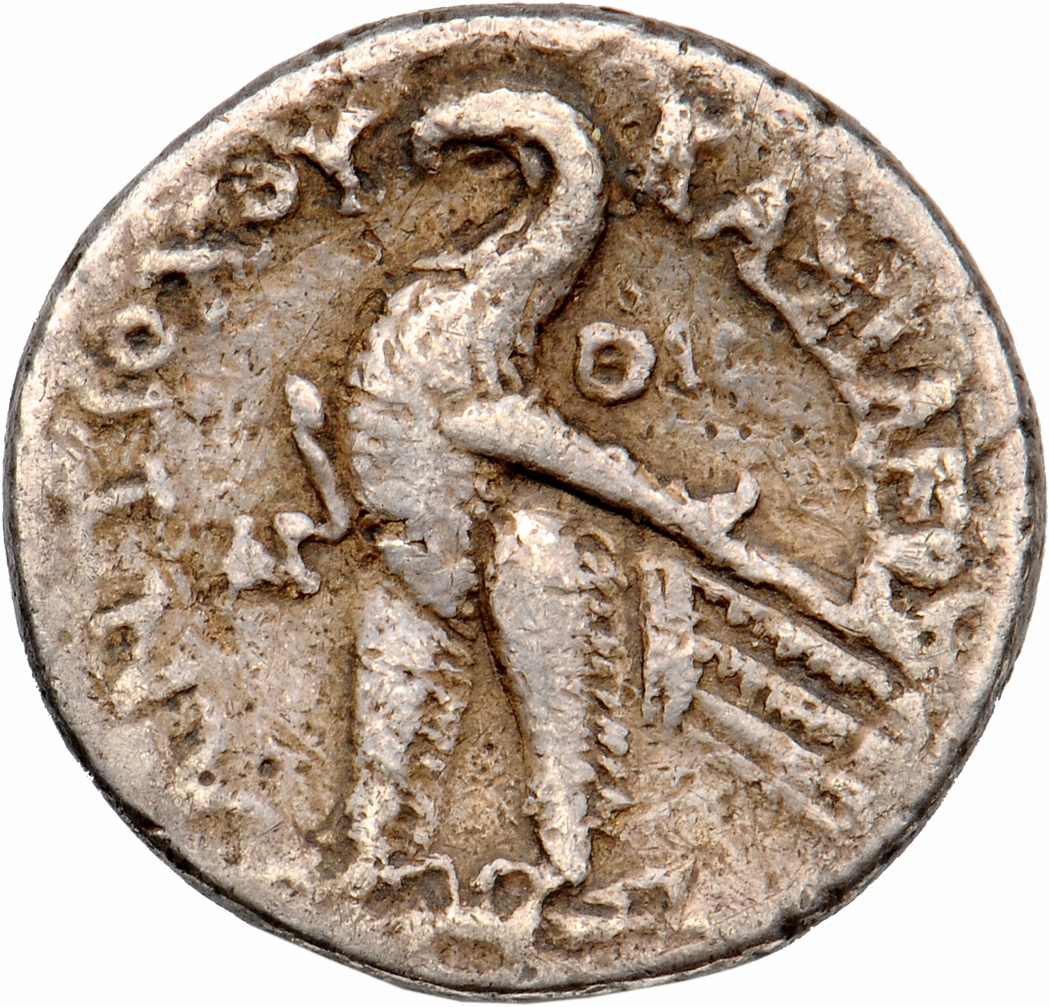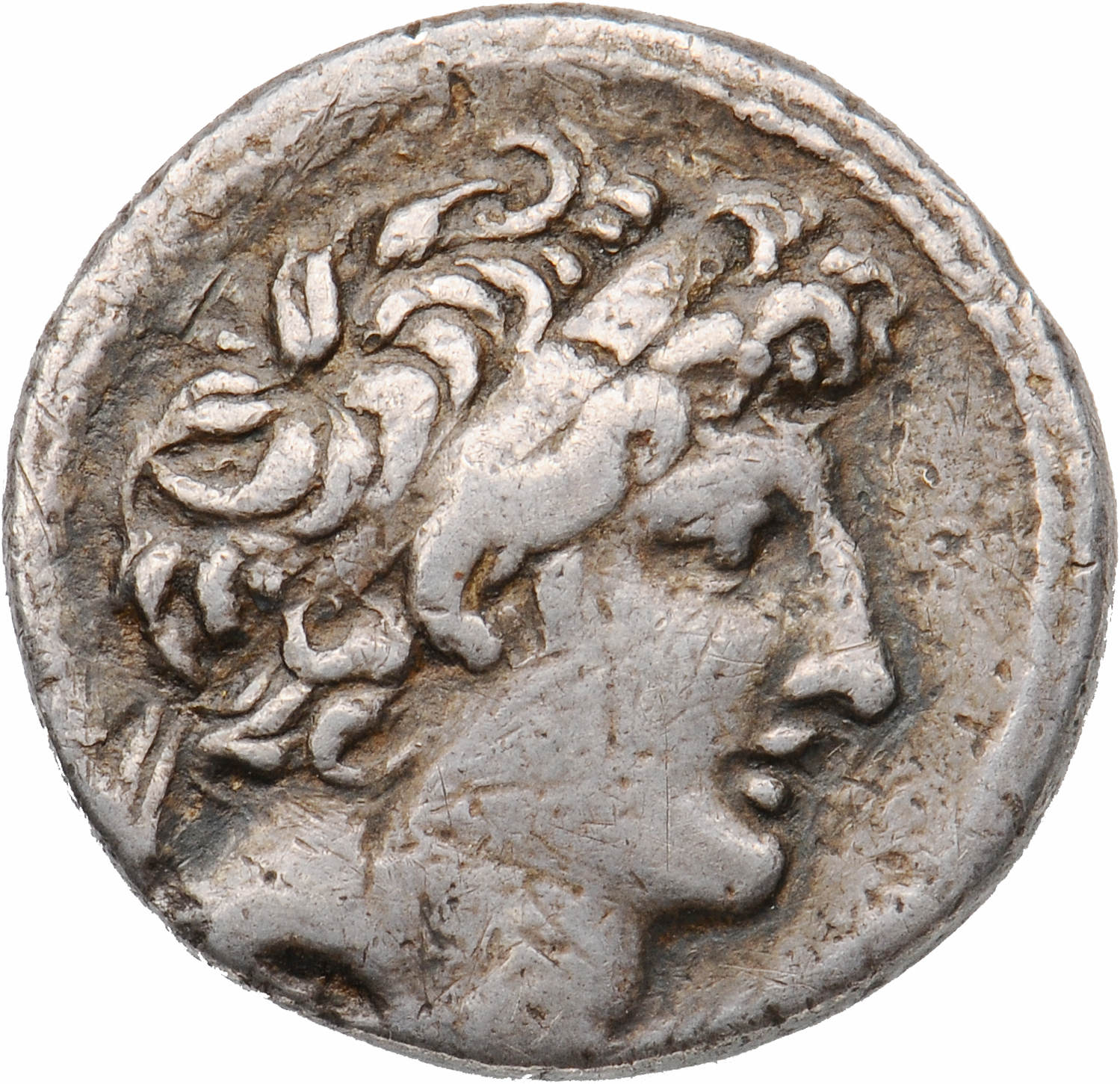 Diademed head of Demetrius II right, bearded, with touseled locks on crown of head and stubby horns at temple