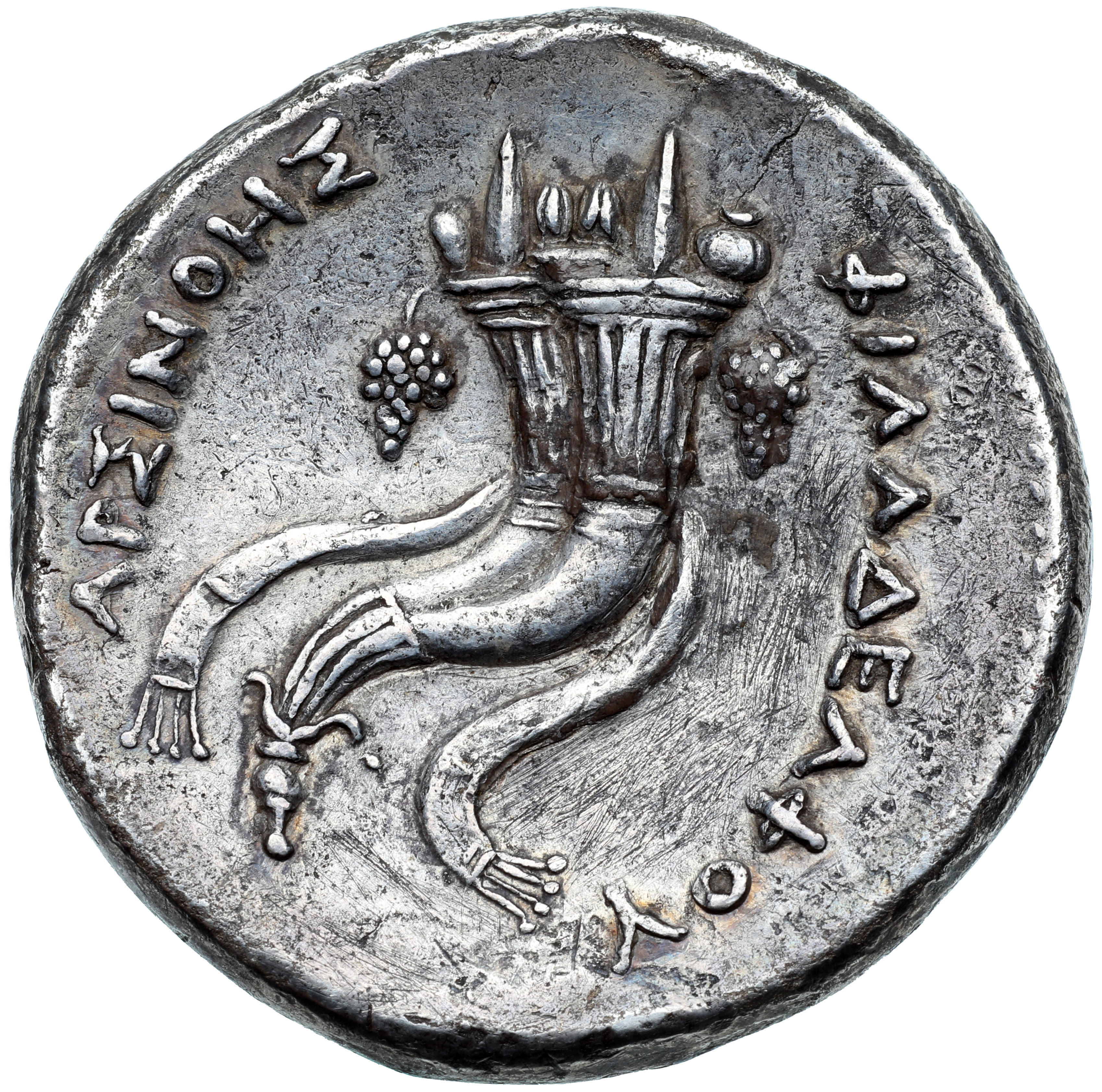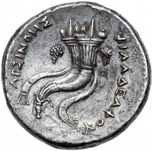 ΑΡΣΙΝΟΗΣ l., ΦΙΛΑΔΕΛΦΟΥ r.: Double Cornucopiae bound with royal diadem, containing pyramidal cakes, pomegranate, and other fruits, a grape cluster hanging from the rim of each horn, dotted border