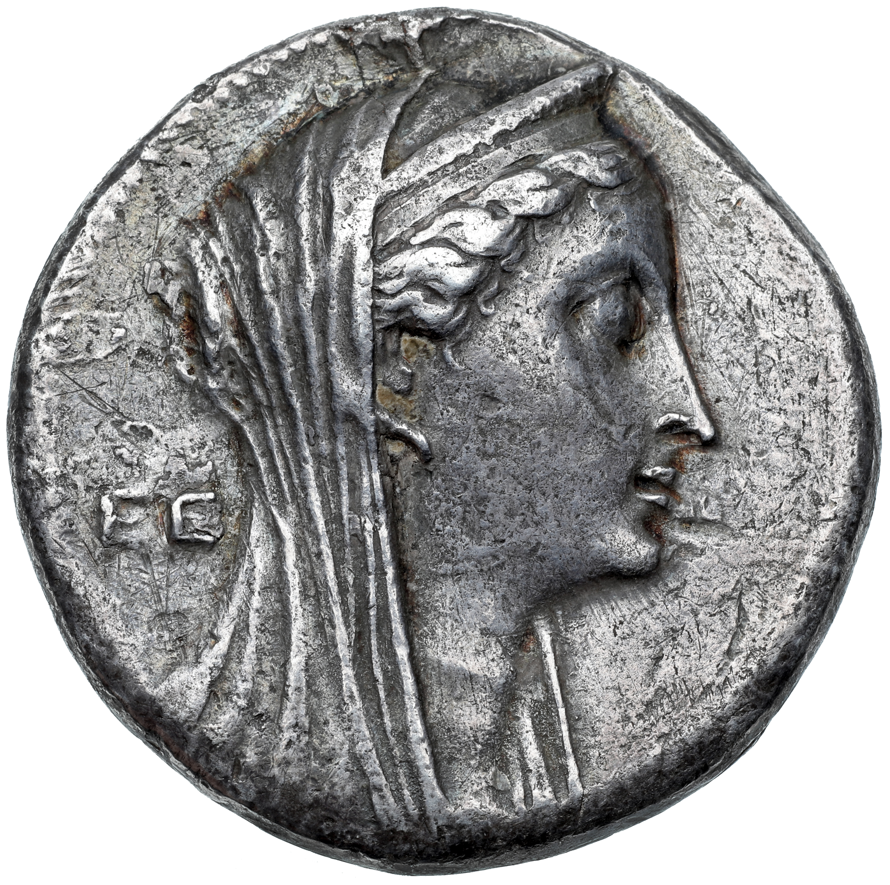 Veiled Head of deified Arsinoe II right, with ram's horn, wearing diademed stephane, lotus scepter over far shoulder, sometimes with serpent coiled around shaft, dotted border