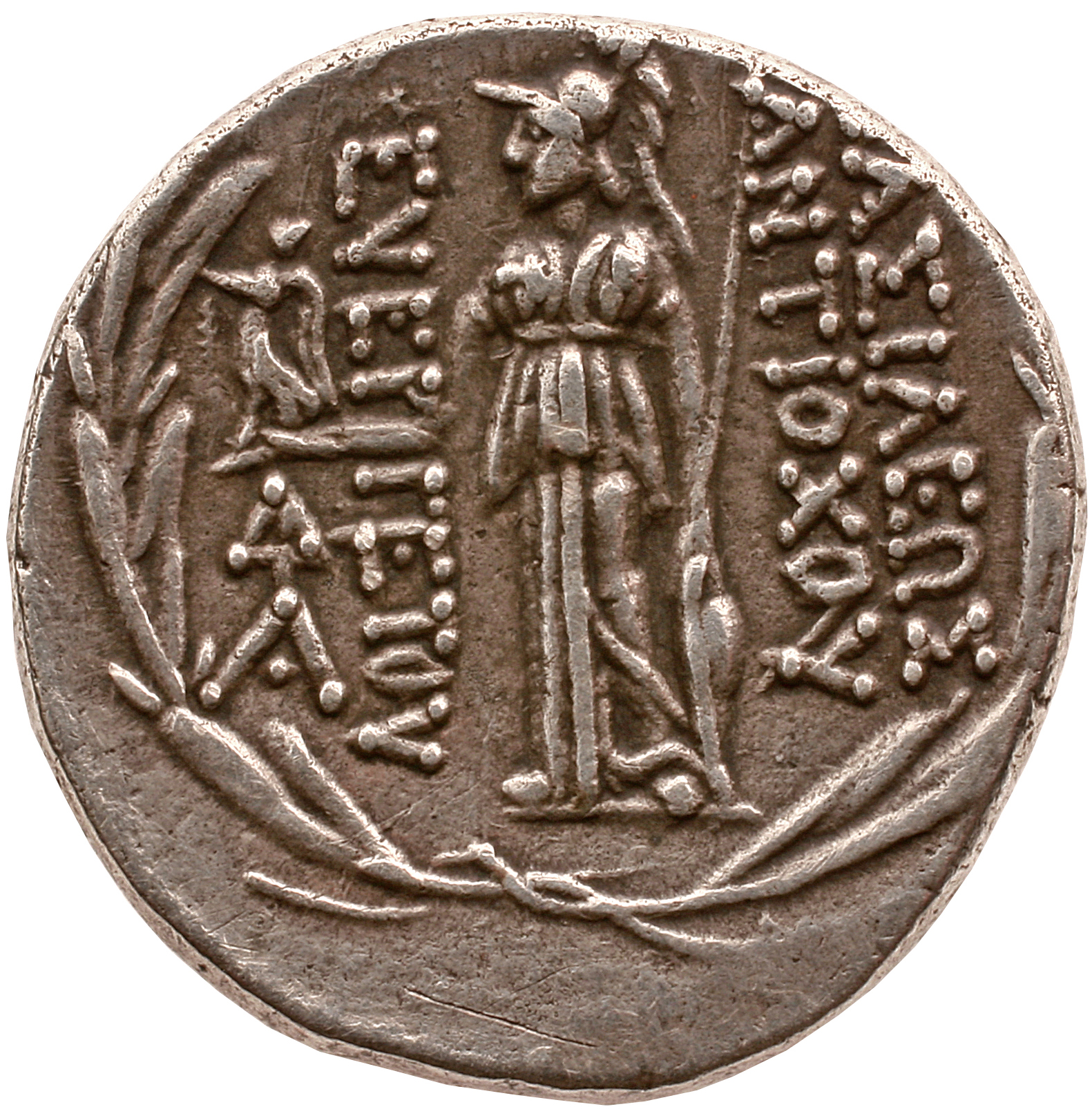 BAΣΙΛΕΩΣ ANTIOXOY EYEPΓETOY: Athena standing left, resting left hand on grounded shield and extending right beyond royal epithet where she supports Nike left, extending wreath into border, spear propped against Athena's arm
