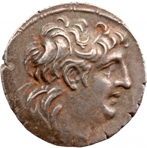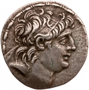 BAΣΙΛΕΩΣ ANTIOXOY EYEPΓETOY: Athena standing left, resting left hand on grounded shield and extending right beyond royal epithet where she supports Nike left, extending wreath into border, spear usually standing vertically behind