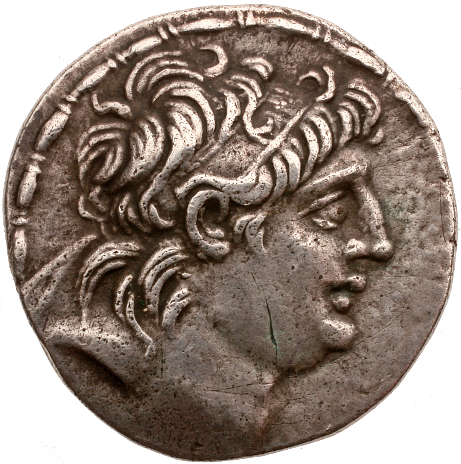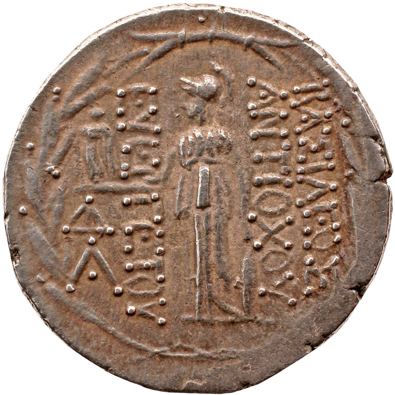 BAΣΙΛΕΩΣ ANTIOXOY EYEPΓETOY: Athena standing left, resting left hand on grounded shield and extending right beyond royal epithet where she supports Nike left, extending wreath into border, vertical spear behind