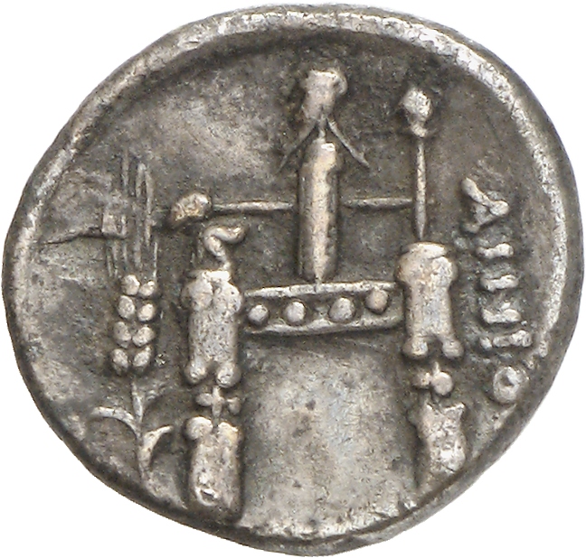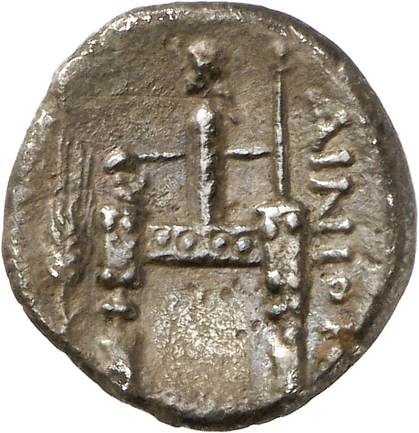 Enthroned cult image of Hermes Perpheraios, left.