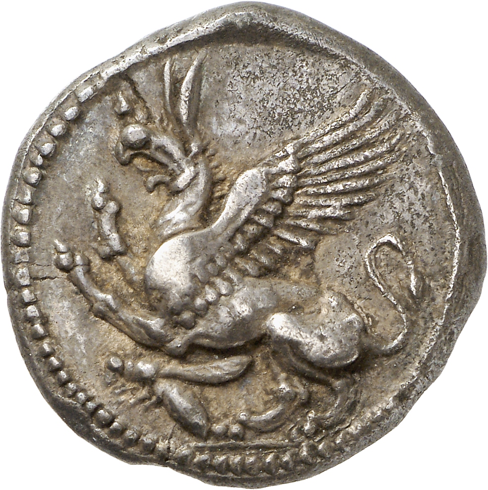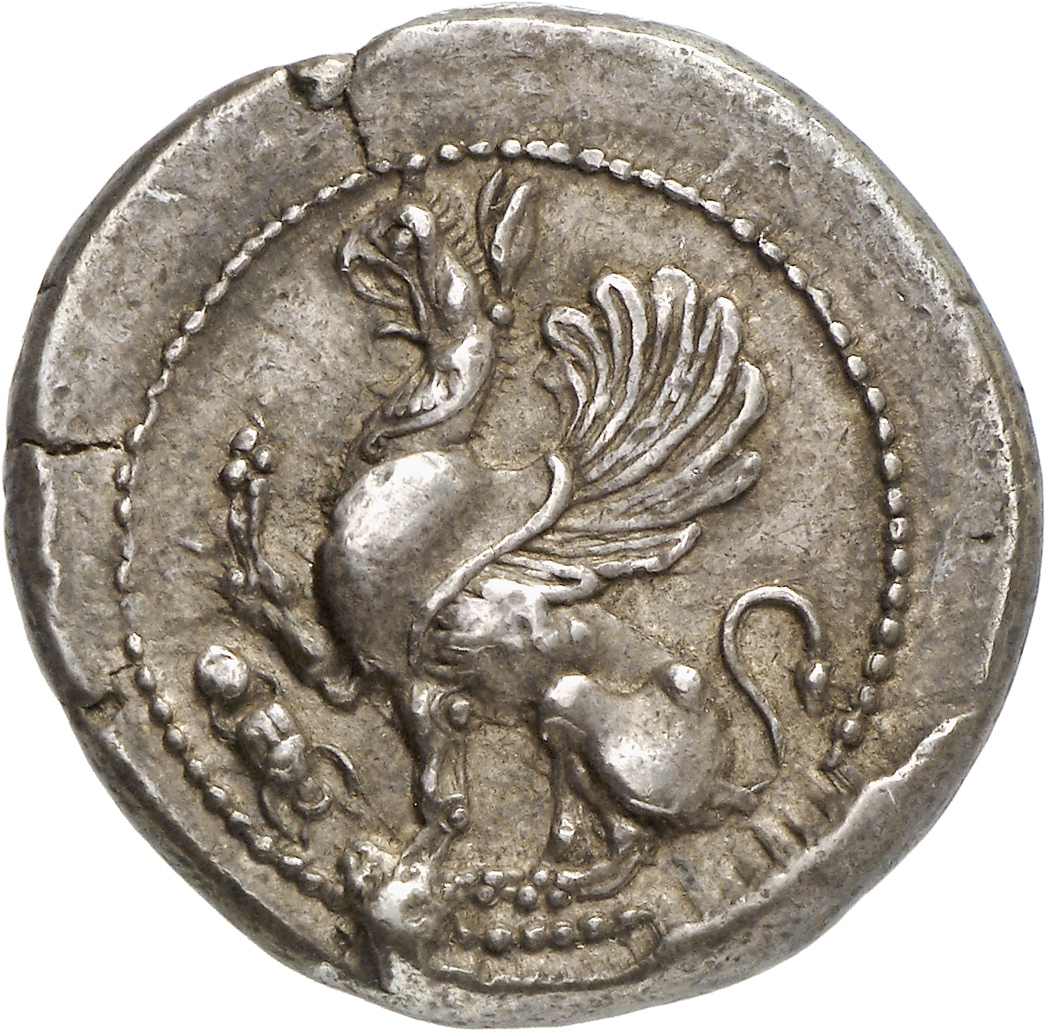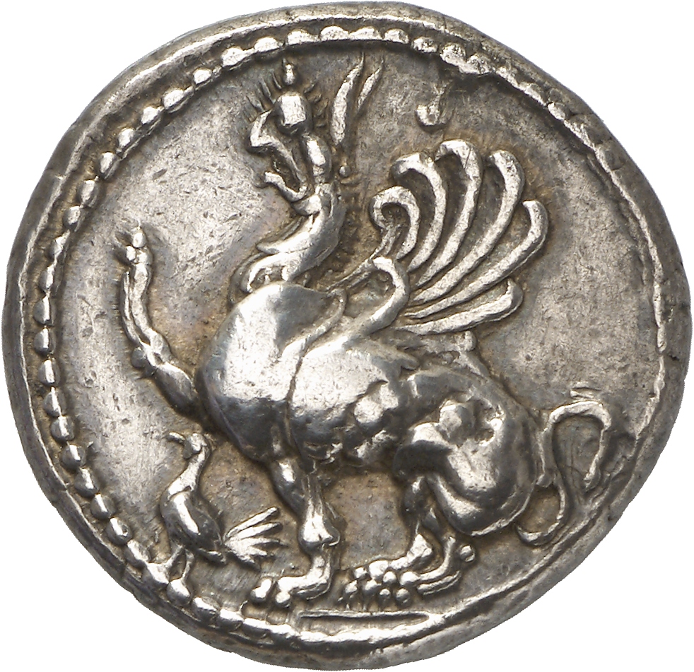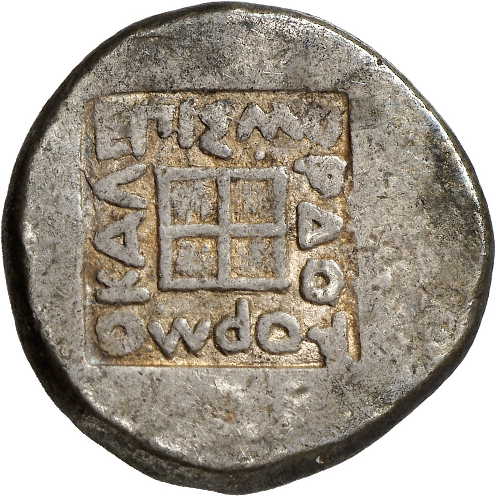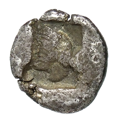 Lion scalp facing, within incuse square.