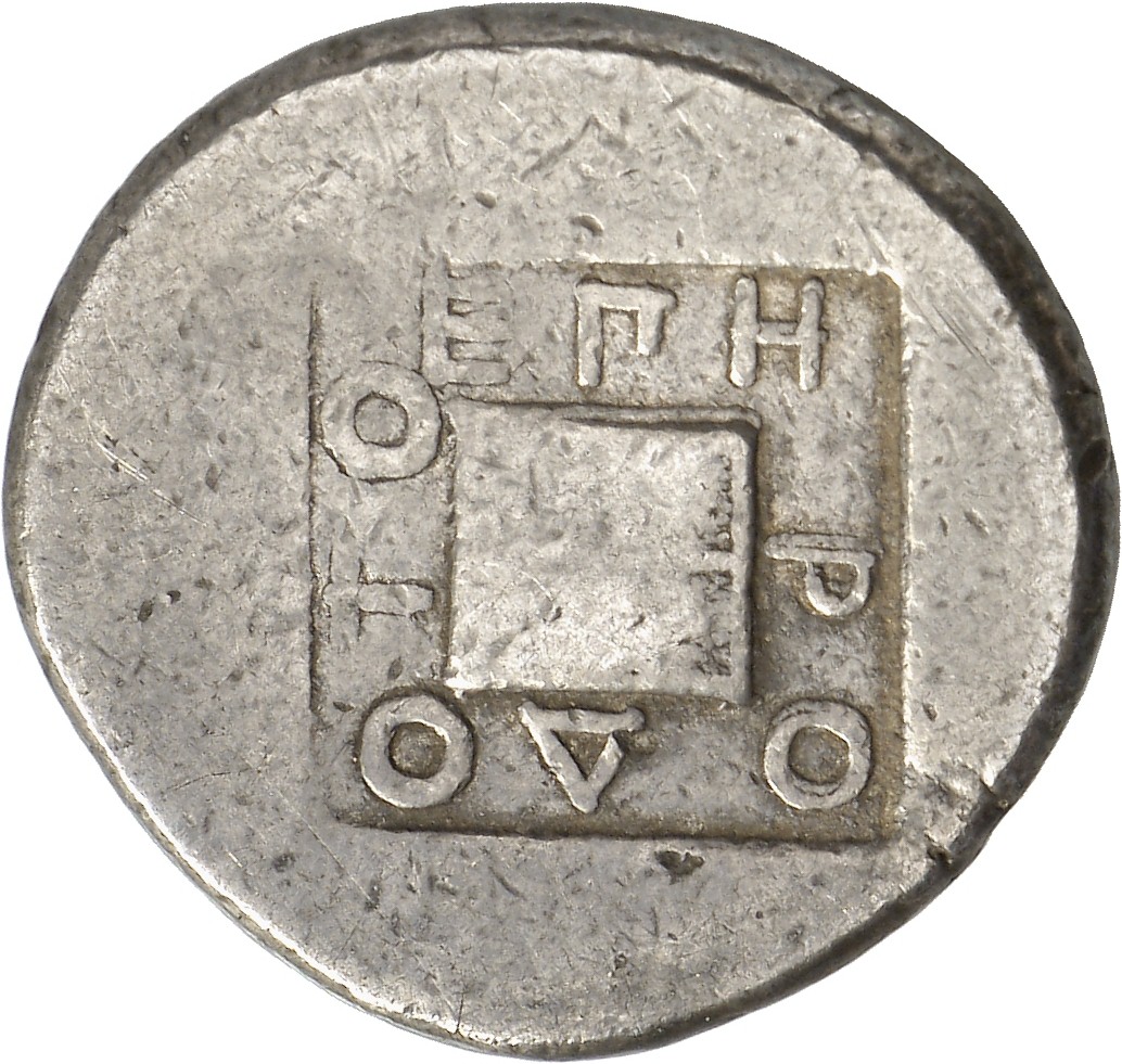 Inscription surrounding a quadripartite linear square; all within incuse square.