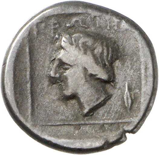Diademed female head, left, in linear square; all within shallow incuse square.
