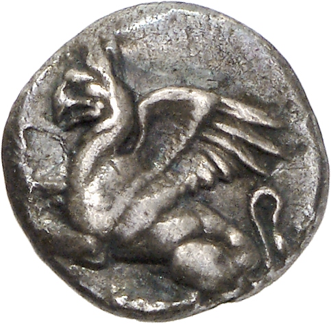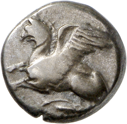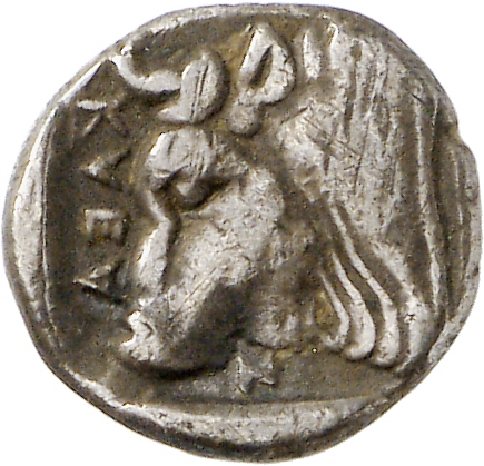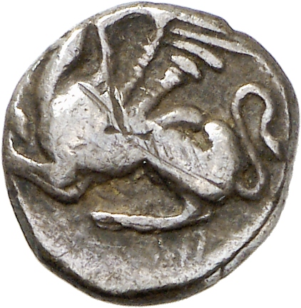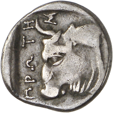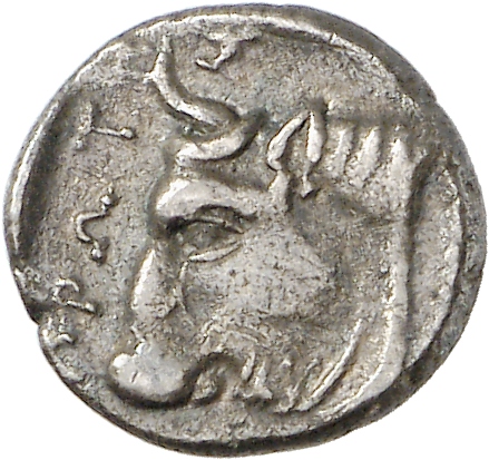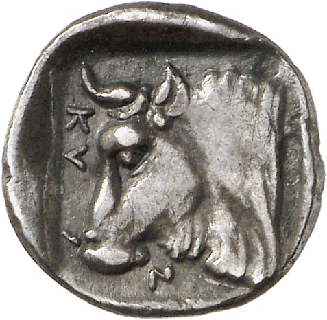 Bull's head and neck, right, a taenia suspended on his left horn. All within incuse square.