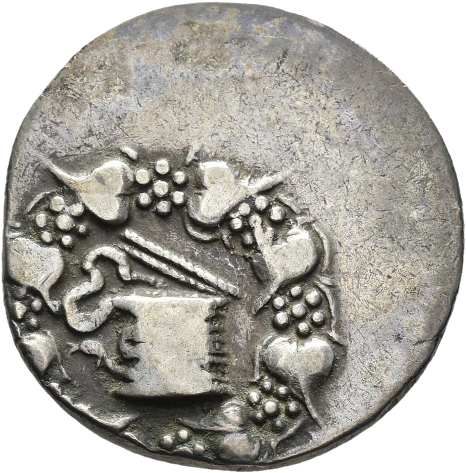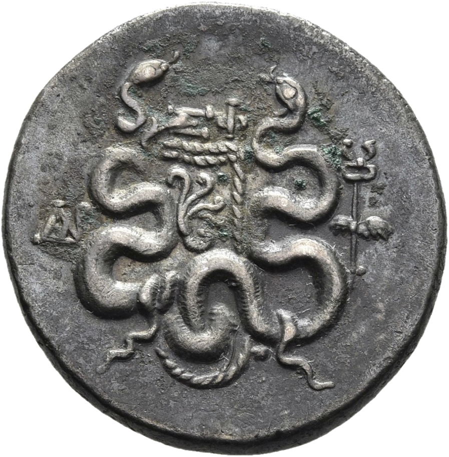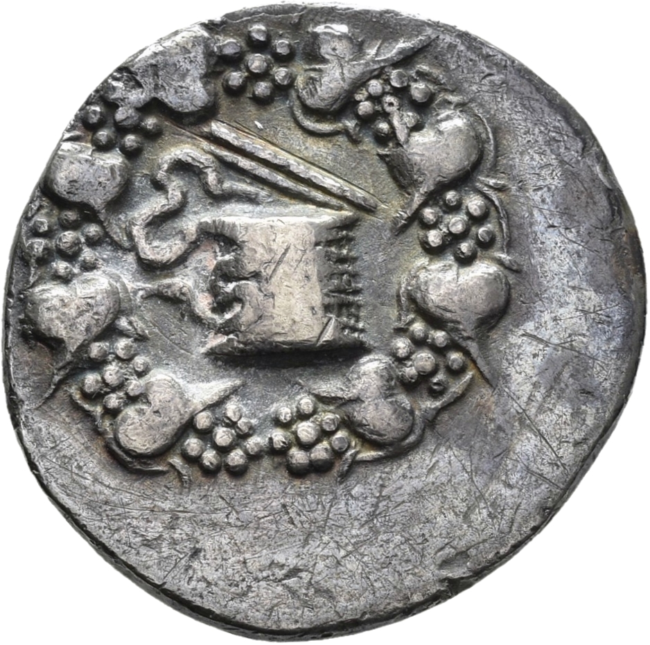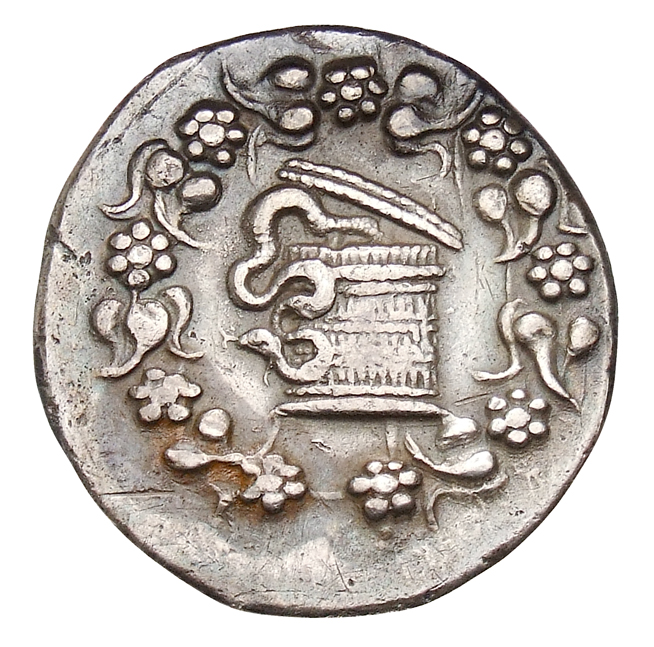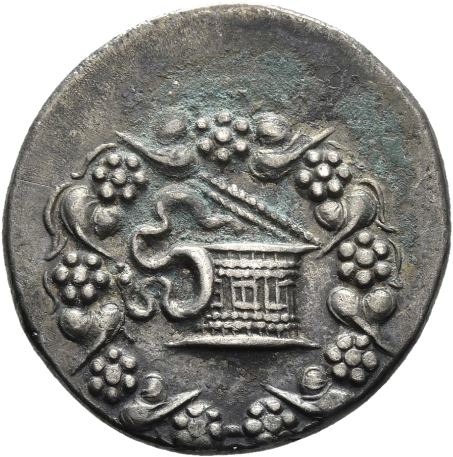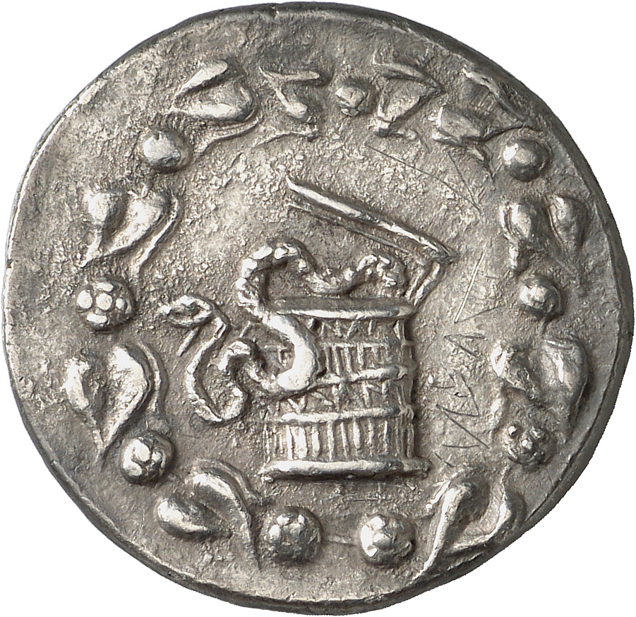 Cista mystica from which a serpent emerges to left, the whole surrounded by an ivy wreath.