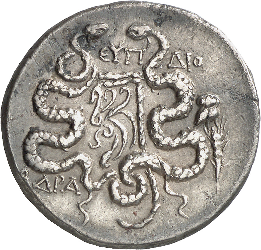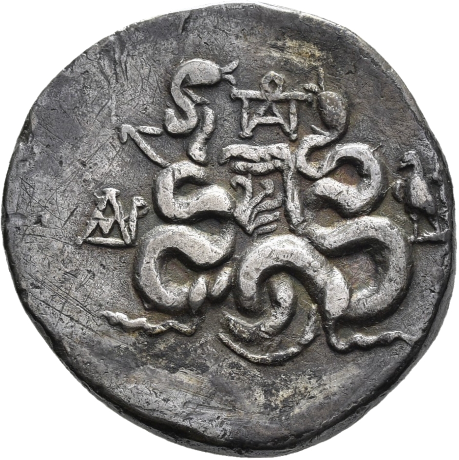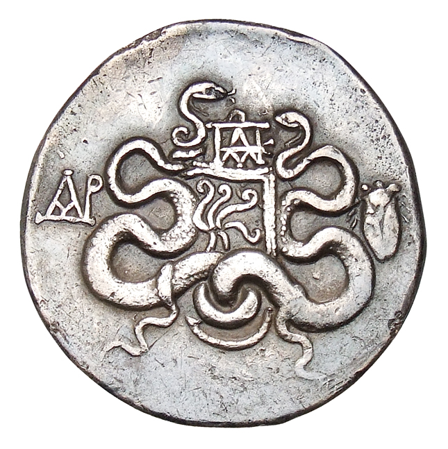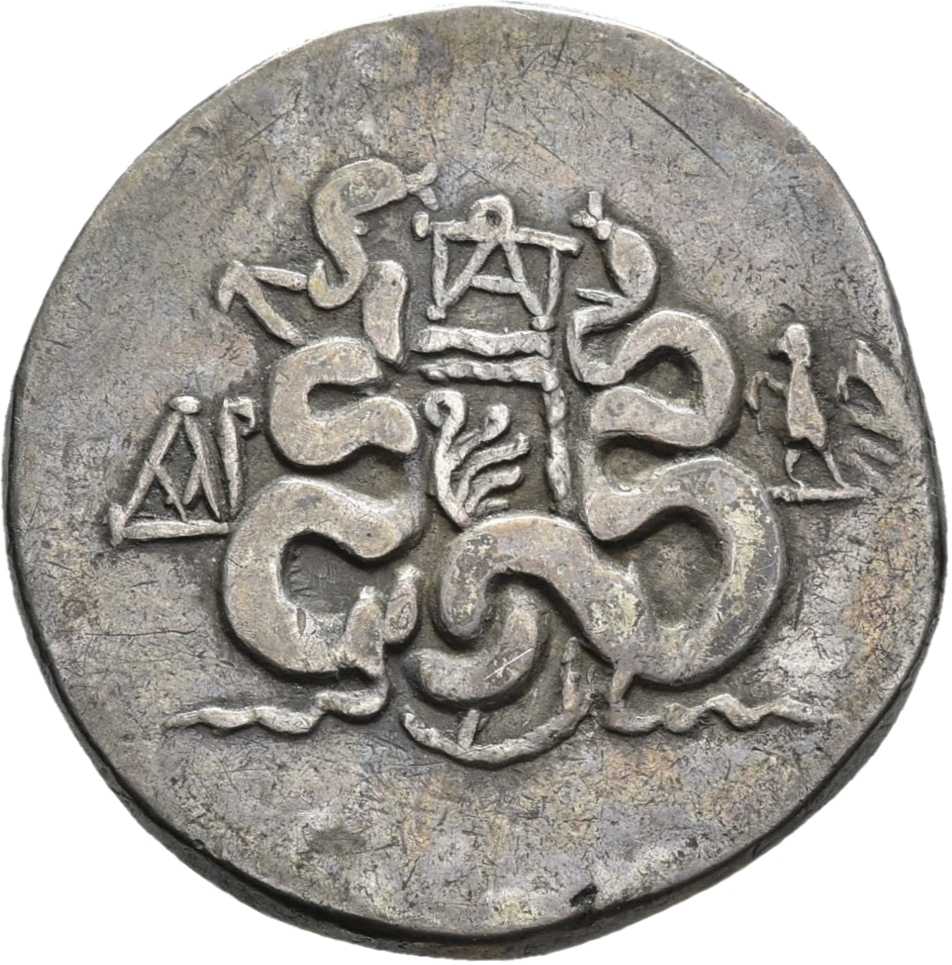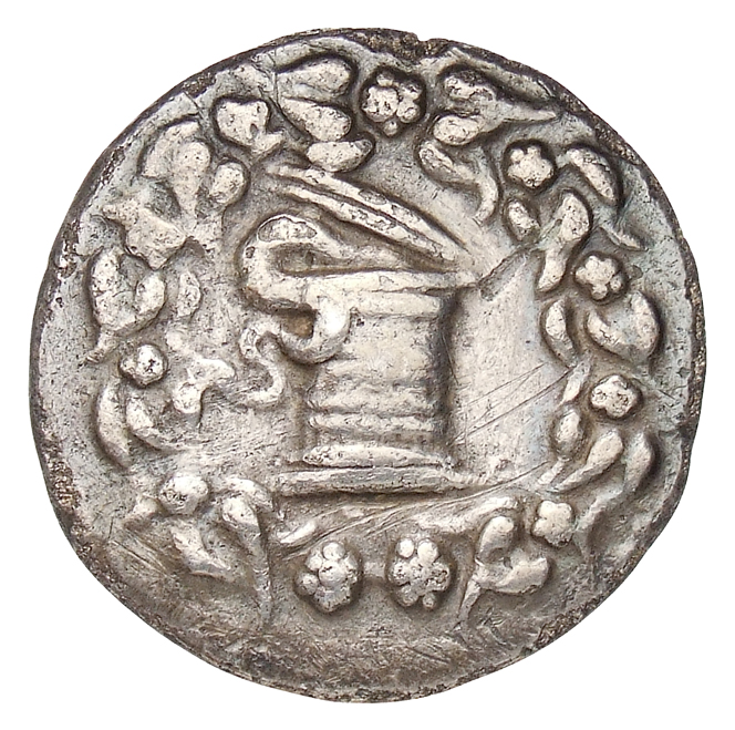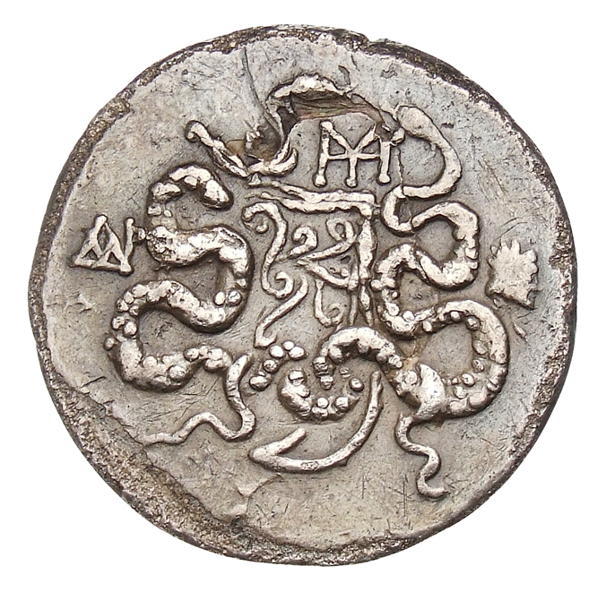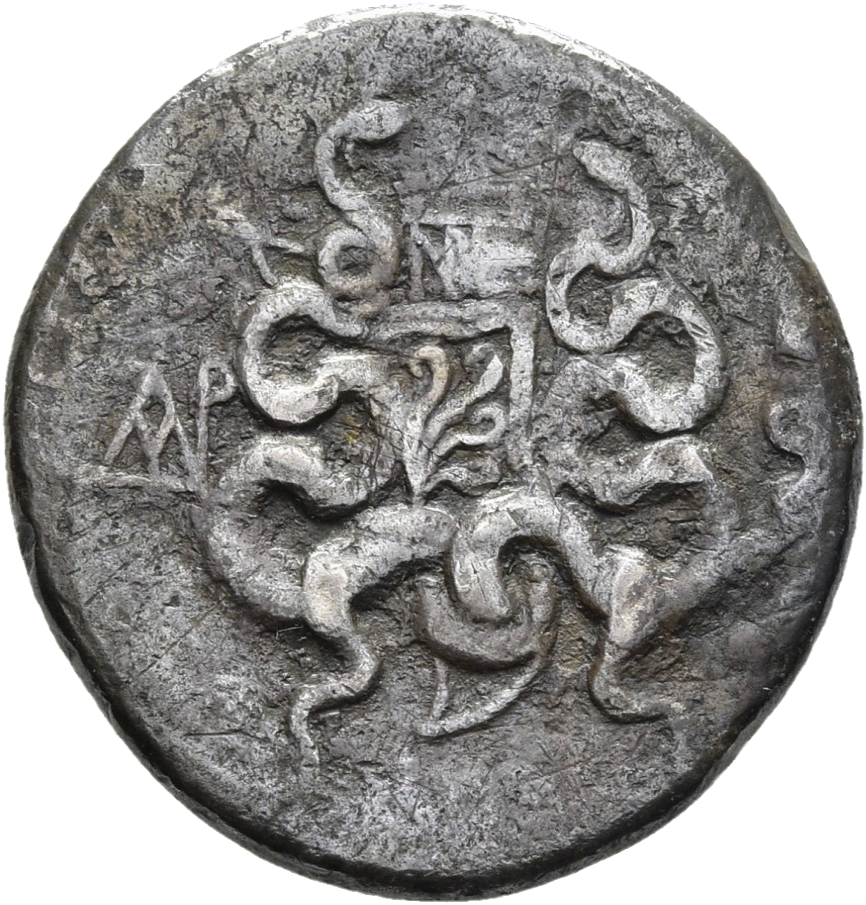 Cista mystica from which a serpent emerges to left, the whole surrounded by an ivy wreath.