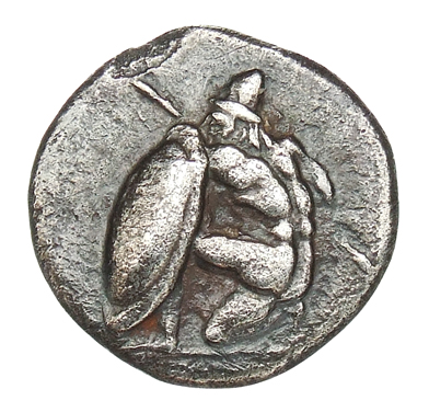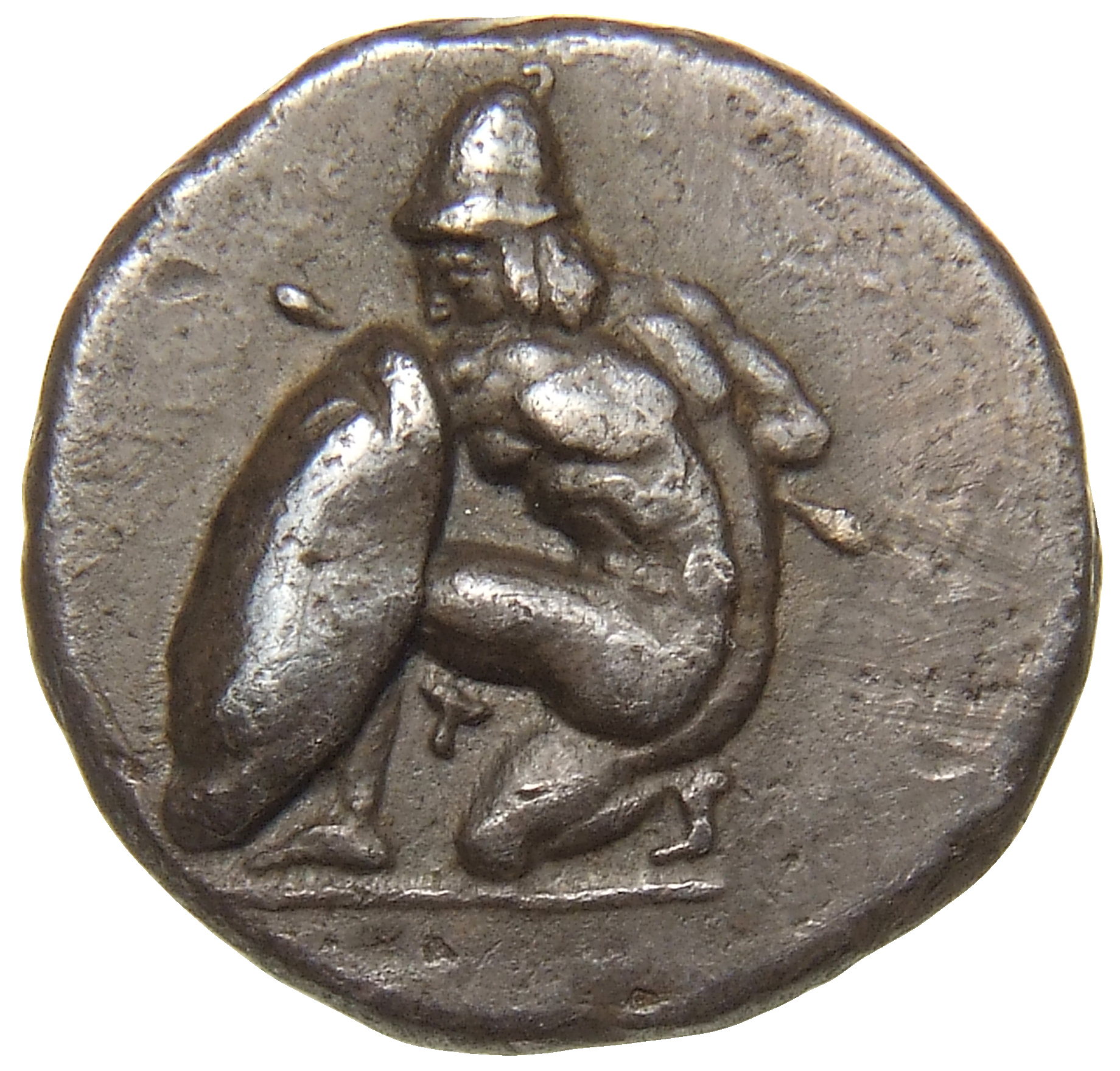 Naked warrior kneeling right, wearing helmet, holding spear and shield.