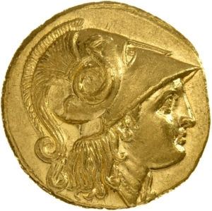 Tête d'Athéna coiffée d'un casque corinthien à cimier à dr.