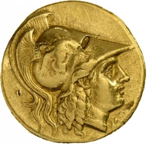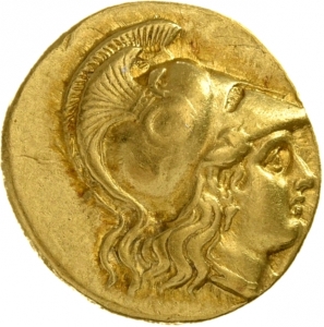 Tête d'Athéna coiffée d'un casque corinthien à cimier à dr., griffon sur le casque
