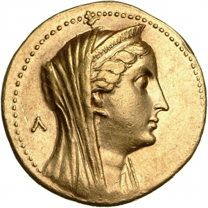 Veiled Head of deified Arsinoe II right, with ram's horn, wearing diademed stephane, lotus scepter over far shoulder, sometimes with serpent coiled around shaft, dotted border