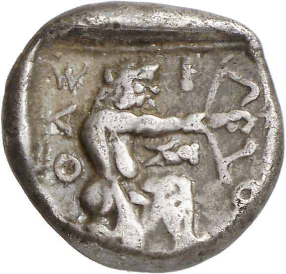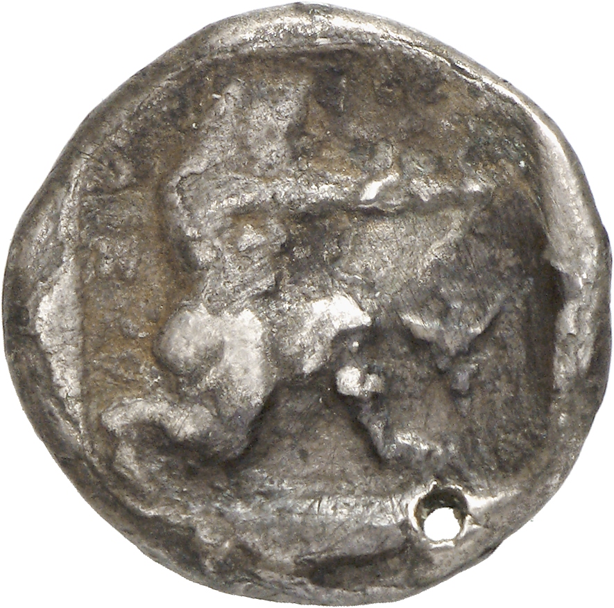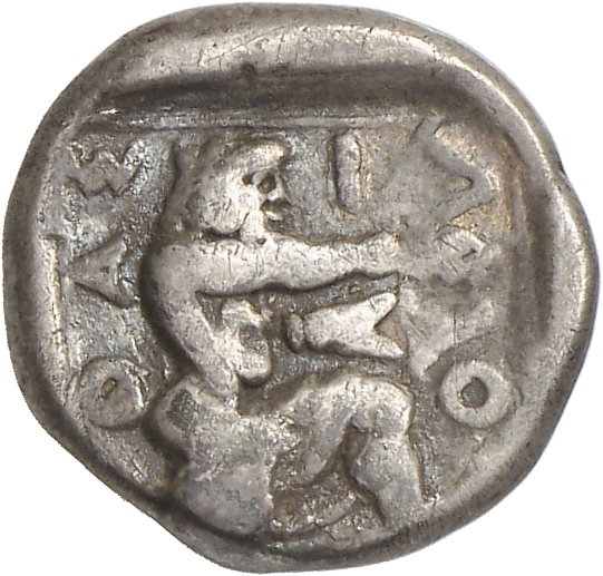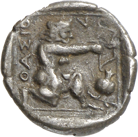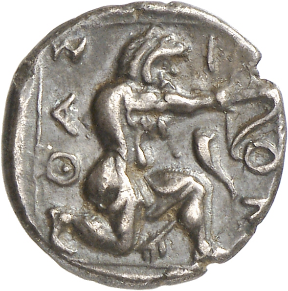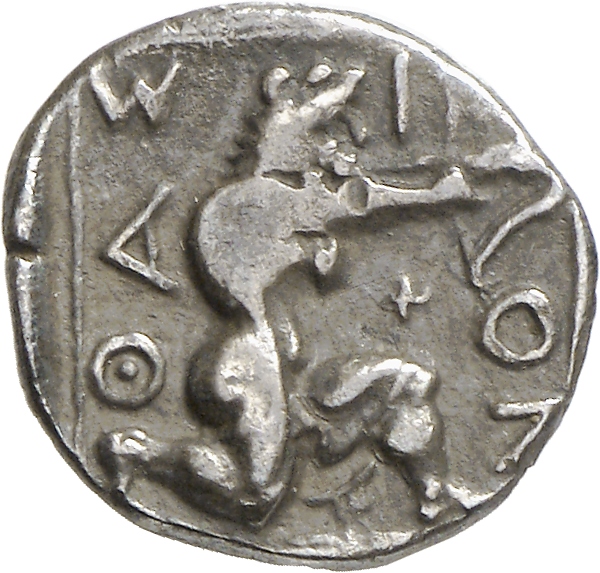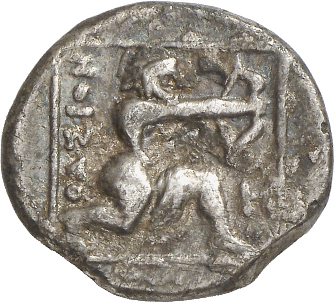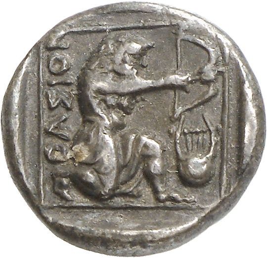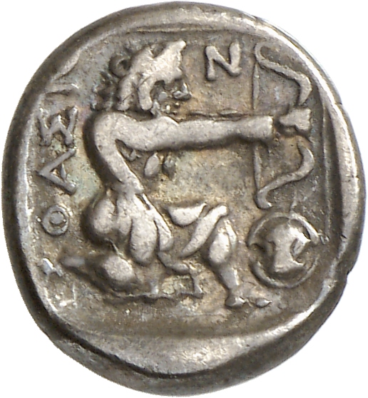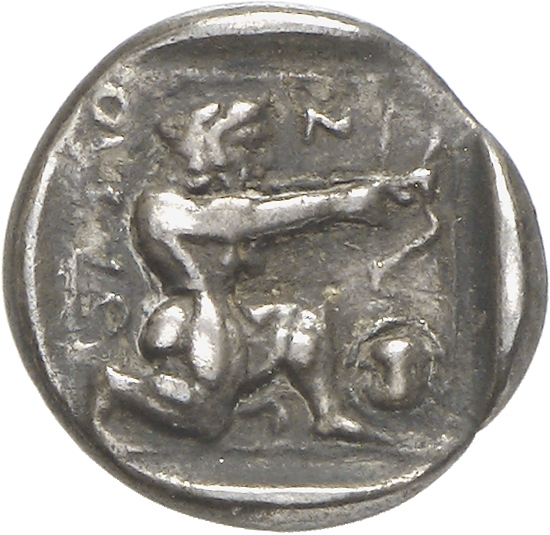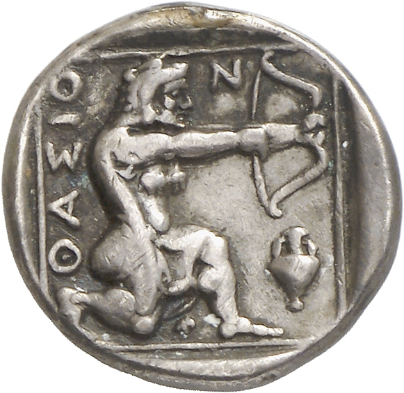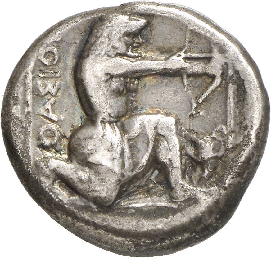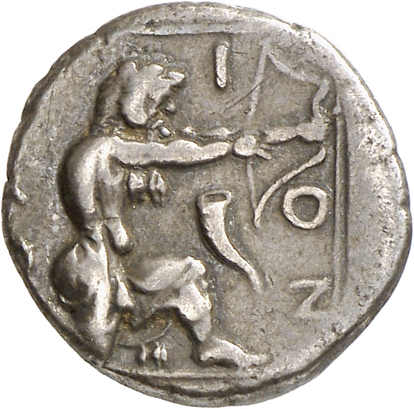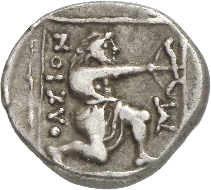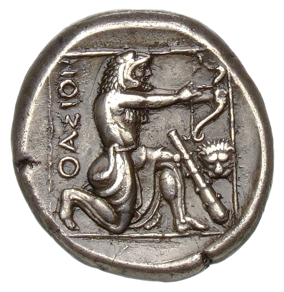 - Heracles kneeling right, wearing lion skin, drawing bow; all within linear square.
