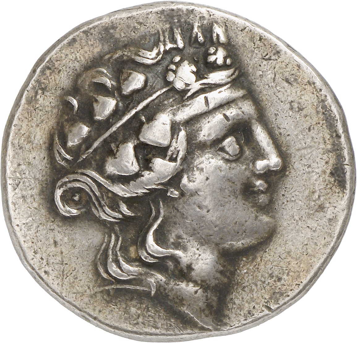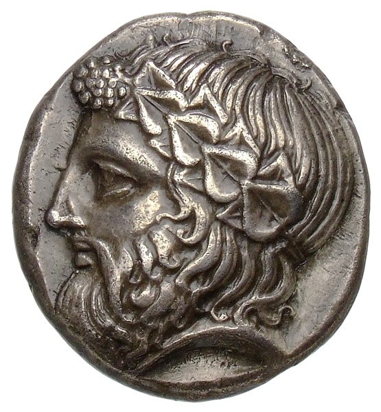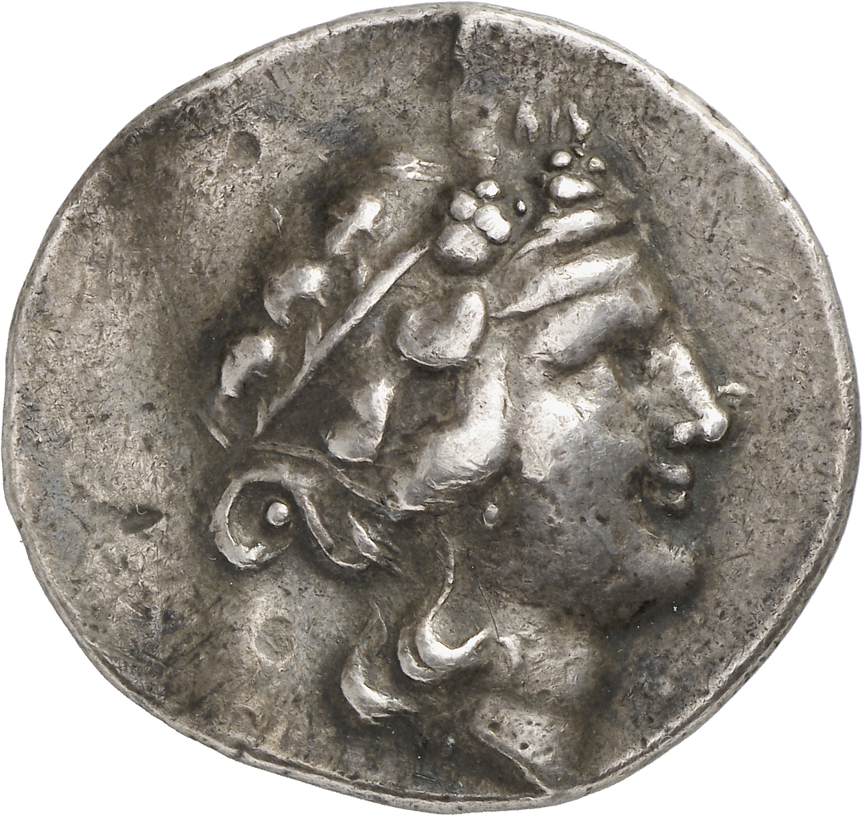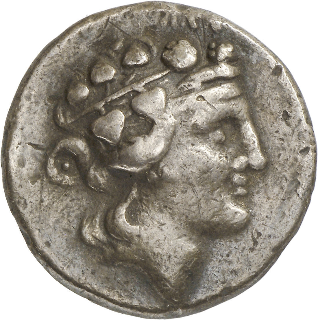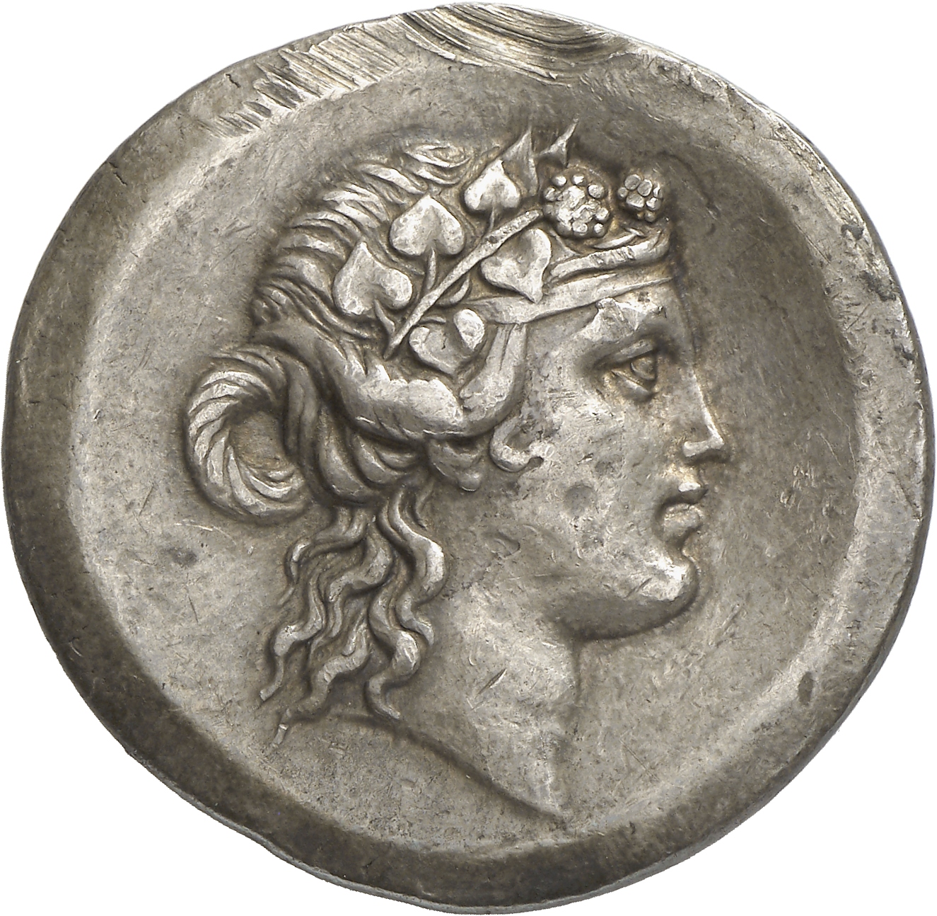 - Head of bearded Dionysus, right, wearing ivy wreath.