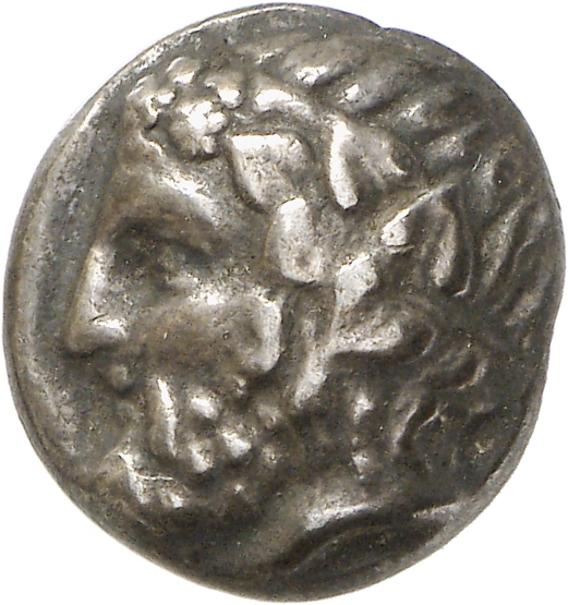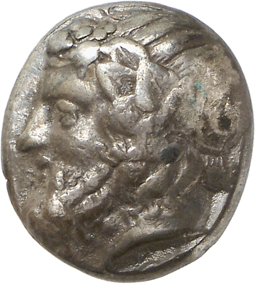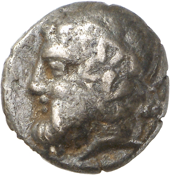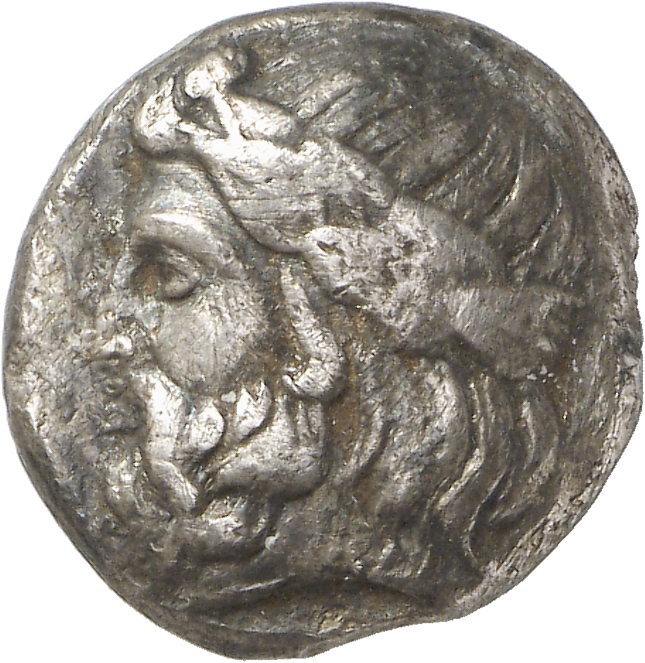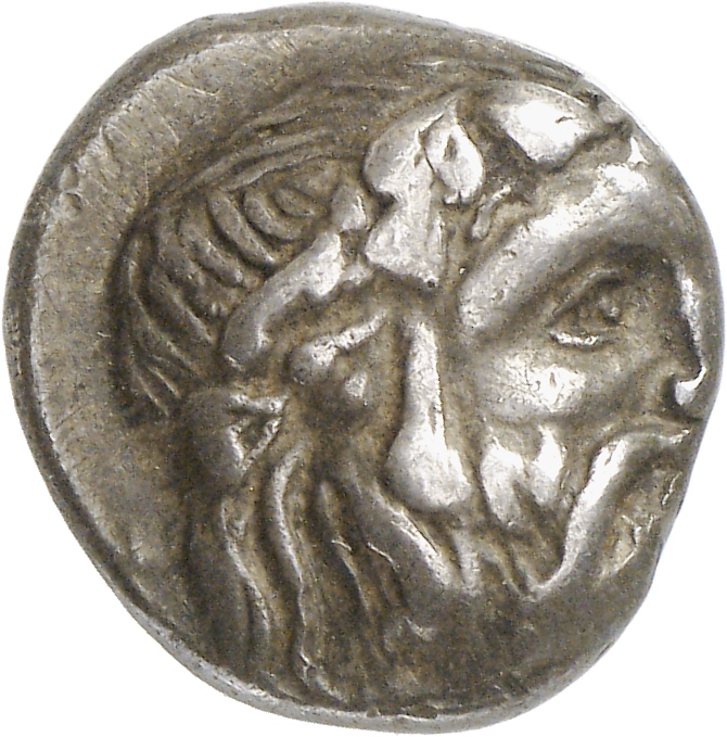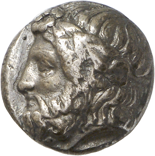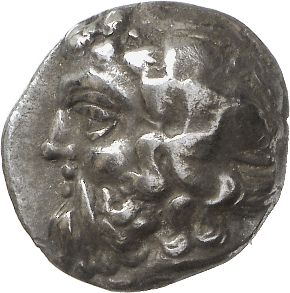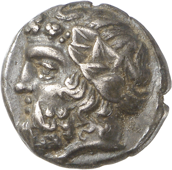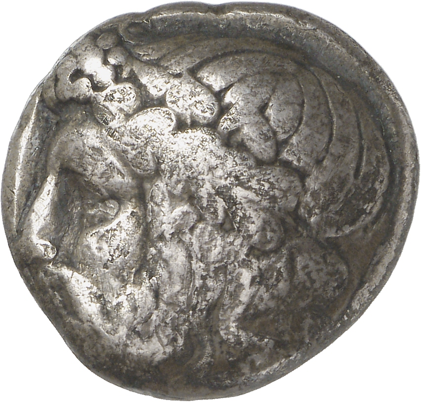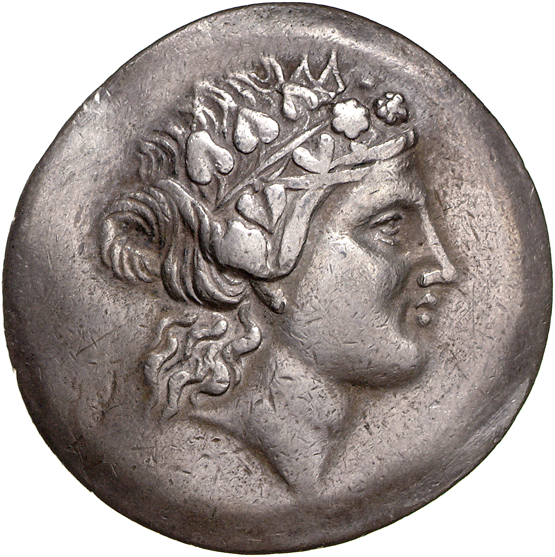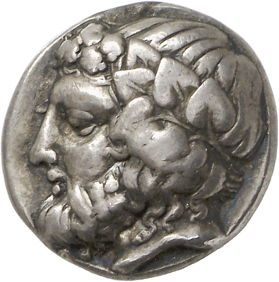 - Head of bearded Dionysus, right, wearing ivy wreath.
