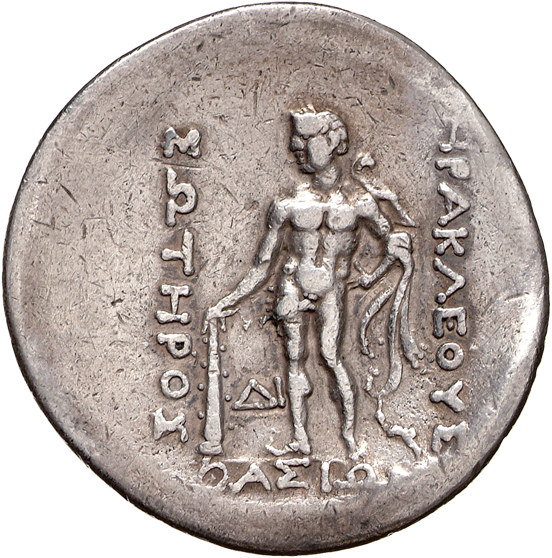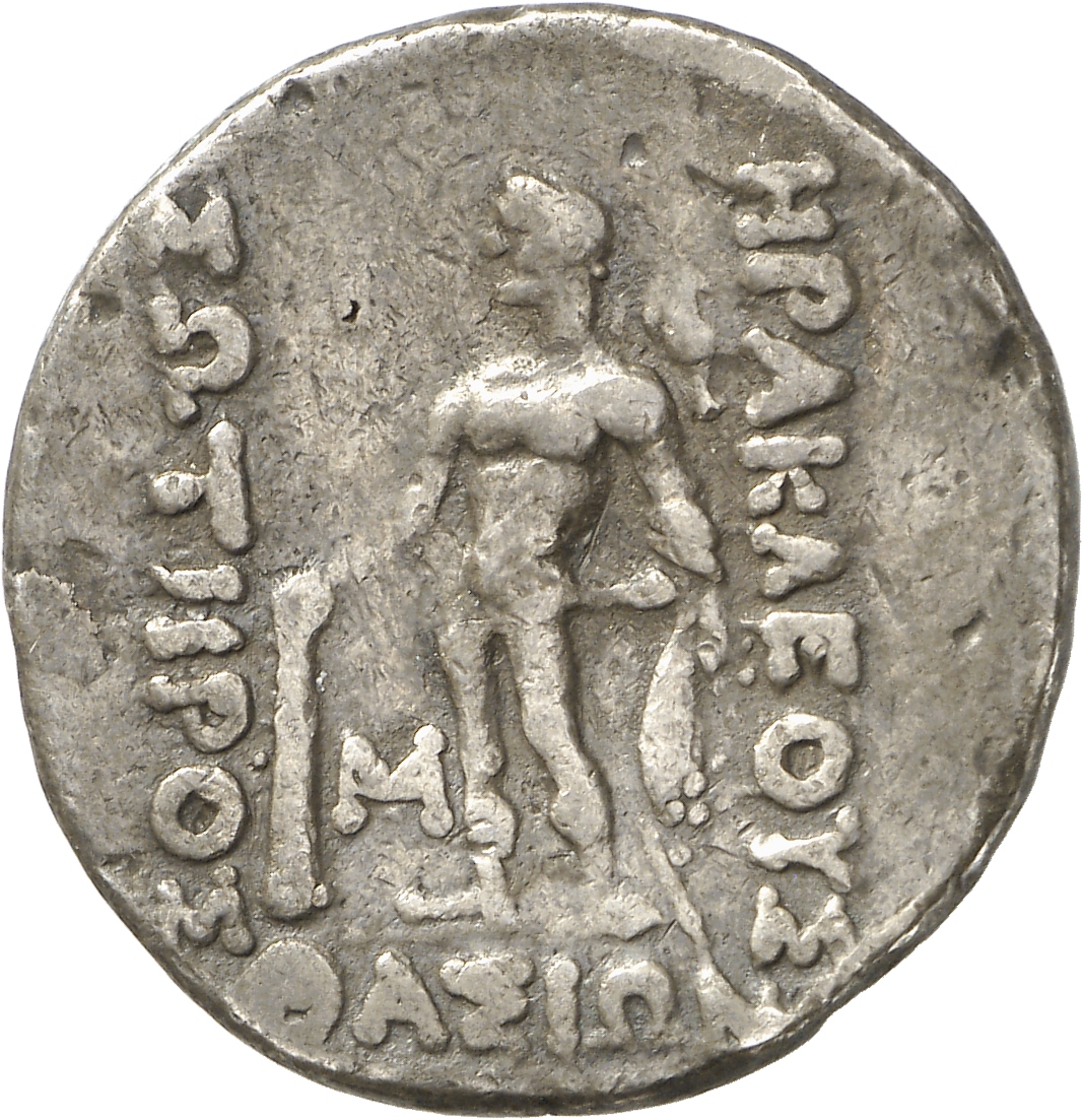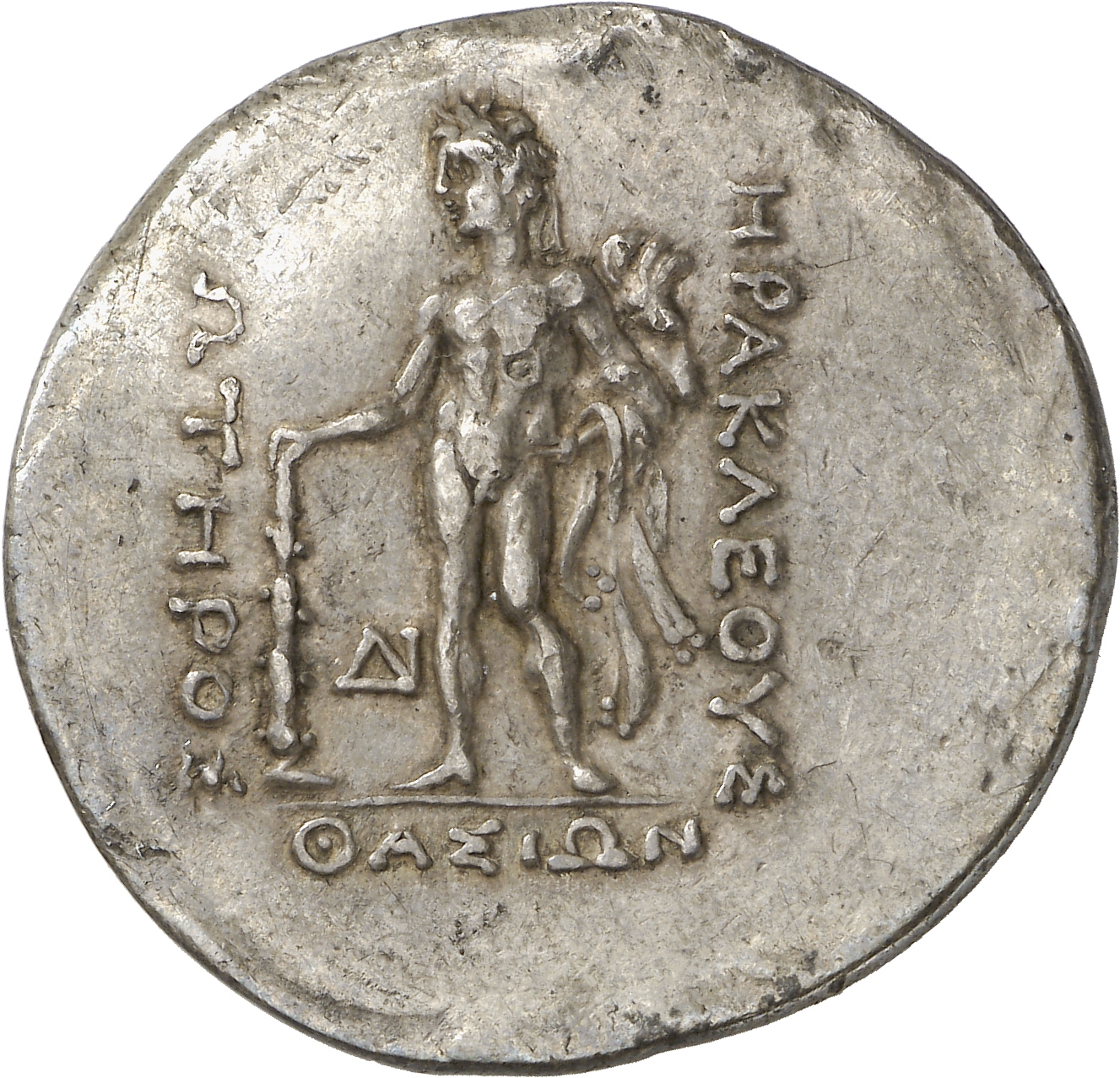 - Nude Heracles standing facing, head left, resting right hand on club, left hand on hip, holding lion skin in left arm.