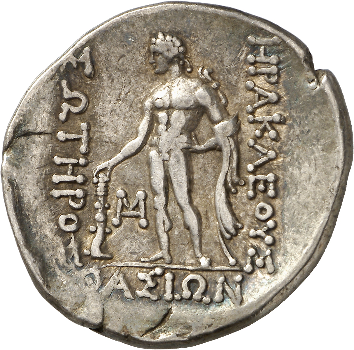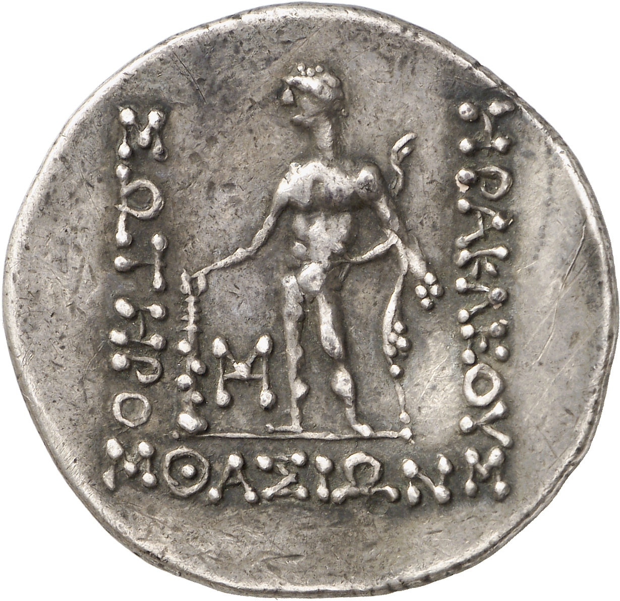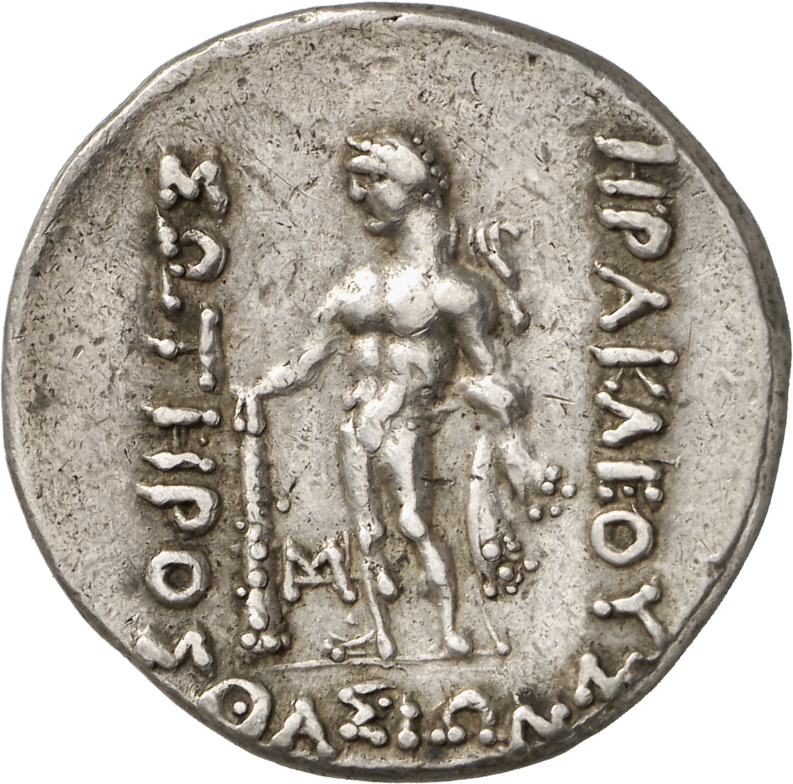 - Nude Heracles standing facing, head left, resting right hand on club, left hand on hip, holding lion skin in left arm.