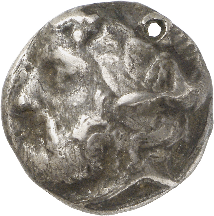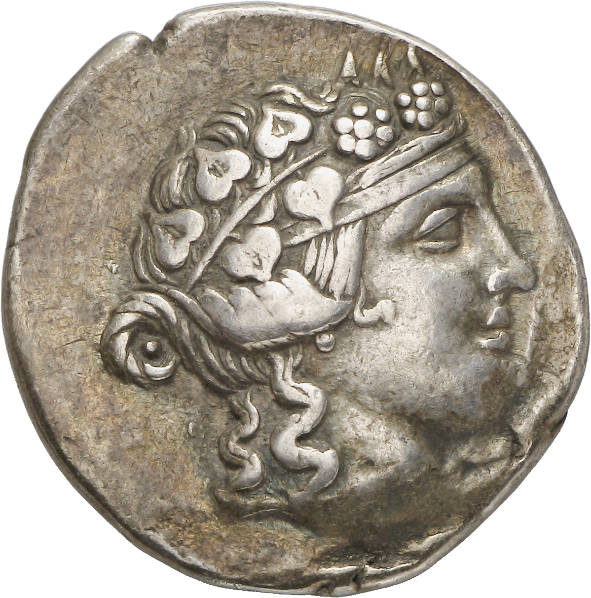 - Head of (youthful) Dionysus, right, wearing ivy wreath with berries.