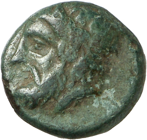 - Head of bearded Dionysus, right, wearing ivy wreath.